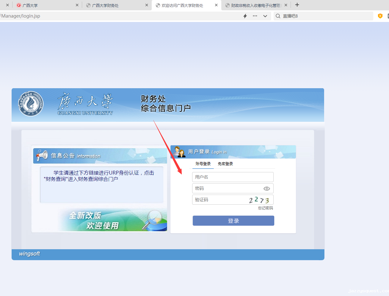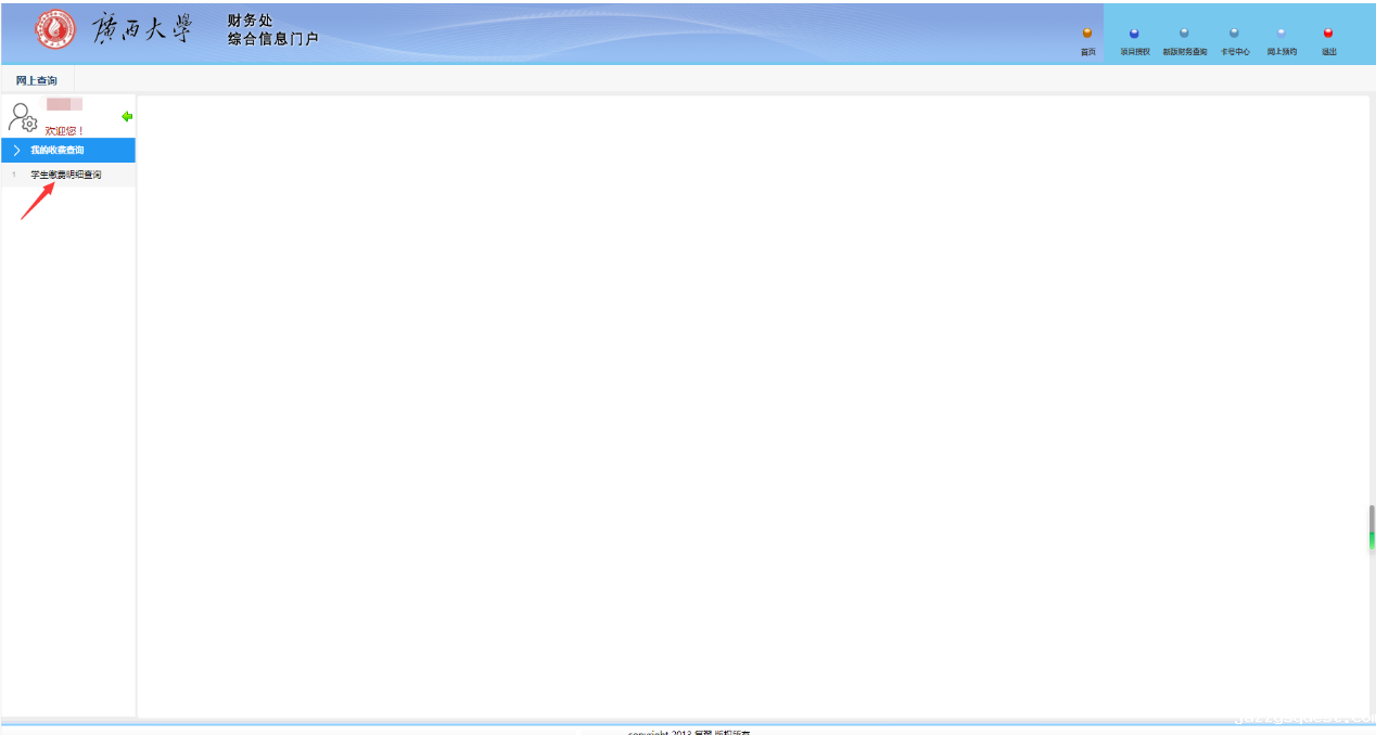 进入“财务处综合信息门户”,按提示页面输入用户名(学号)及查询密码(原始密码为身份证后八位的前六位位)。