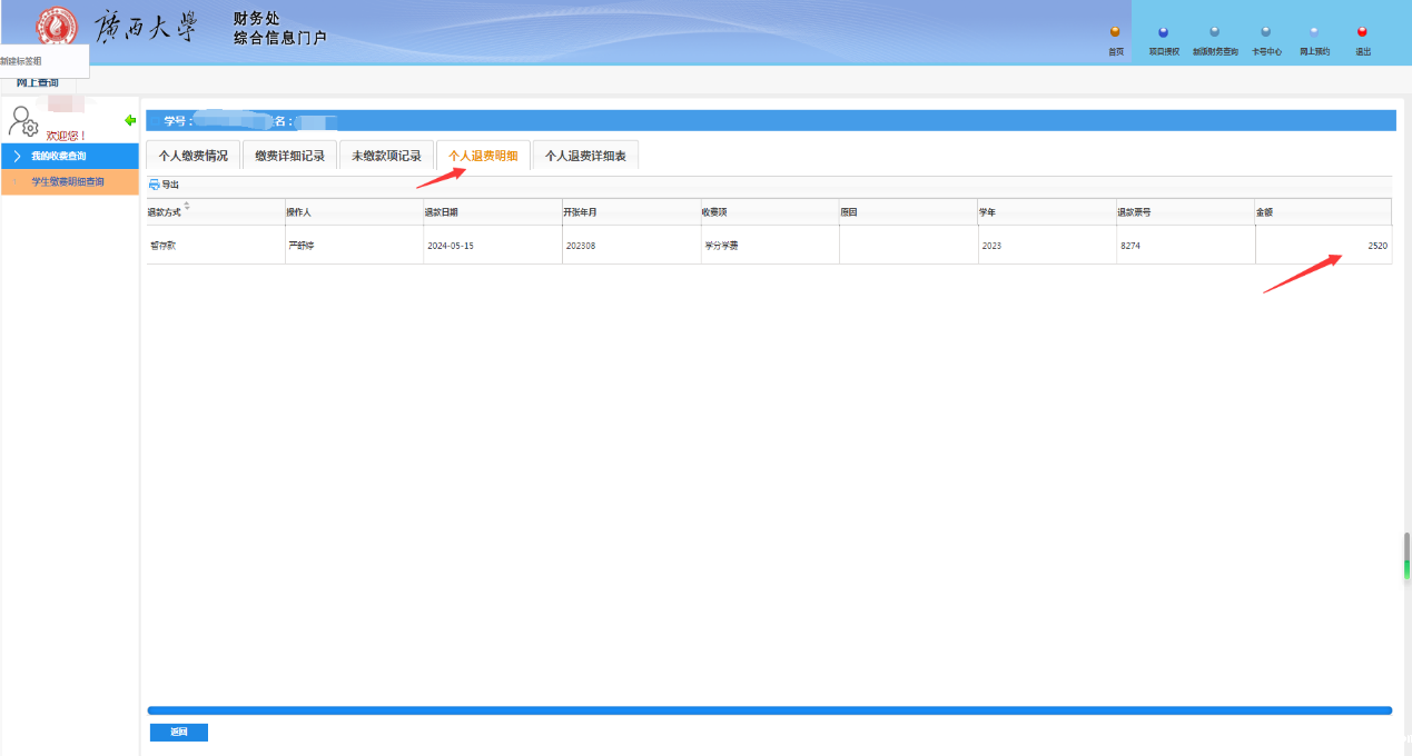 6、如需查询退费情况,可在“个人退费明细”中查询。对毕业清算的退费金额,则按“个人退费明细”中查询到的最后一笔退费,抵减完本学年需抵减的学宿费用后(“缴费详细记录”中最后一学年的暂存款即为需抵减的学宿费用),才为实际应退入学生本人银行卡中的金额。以下图为例: