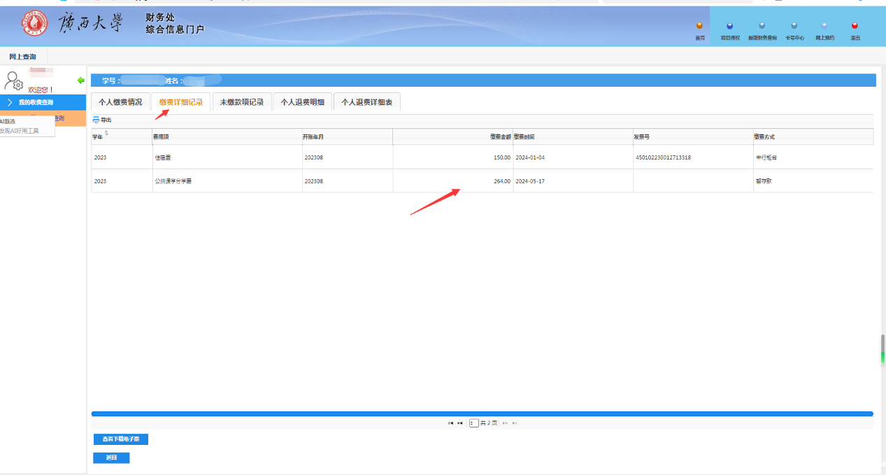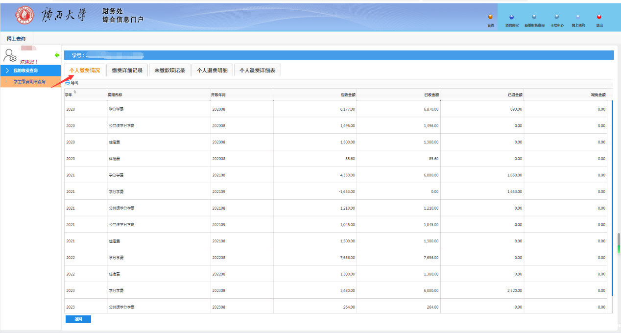 接着,点击“学生缴费明细查询”→“个人缴费明细查询”→“查询全部缴费情况”,再点击学号即可查看全部的学宿费缴费明细。