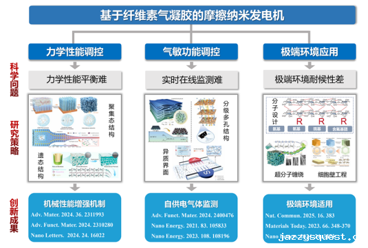 ໃນຊຸມປີມໍ່ໆມານີ້, ພາຍໃຕ້ການນໍາພາຂອງ Nie Shuangxi, ກຸ່ມດັ່ງກ່າວໄດ້ດໍາເນີນການຄົ້ນຄ້ວາພື້ນຖານຢ່າງເປັນລະບົບກ່ຽວກັບການກໍ່ສ້າງແລະກ້າວຫນ້າທາງດ້ານອຸປະກອນທີ່ເປັນປະໂຫຍດຂອງເຈ້ຍ, ແລະວາງທິດທາງການຄົ້ນຄວ້າຂອງ "Frictional Nanogenerator Based on Cellulose Aerogel", ເຊິ່ງແກ້ໄຂບັນຫາຄໍຂວດຂອງຄວາມທົນທານຕໍ່ດິນຟ້າອາກາດທີ່ບໍ່ດີໃນສະພາບແວດລ້ອມທີ່ໂຫດຮ້າຍແລະຍາກທີ່ຈະປັບປຸງຄຸນສົມບັດກົນຈັກຂອງ ແຮງສຽດສີ ແບບດັ້ງເດີມ. ໂດຍຜ່ານຍຸດທະສາດຂອງລະບຽບໂຄງສ້າງການລວບລວມ cellulose airgel ແລະວິສະວະກໍາການໂຕ້ຕອບຂອງໂຄງສ້າງໄມ້ທີ່ສົມບູນ, ພວກເຂົາເຈົ້າໄດ້ວິເຄາະຄວາມສໍາພັນລະຫວ່າງ ແຮງລະຫວ່າງໂມເລກຸນ cellulose ແລະຄຸນສົມບັດກົນຈັກ, ຊີ້ແຈງ ກົນໄກການກະຈາຍພະລັງງານຂອງ cellulose triboelectric aerogels, ແລະແຕກແຍກໂດຍຜ່ານບັນຫາທີ່ ນ້ຳໜັກເບົາແລະຄວາມແຂງສູງຂອງອຸປະກອນການ. ໂດຍຜ່ານຍຸດທະສາດຂອງວິສະວະກໍາການໂຕ້ຕອບ ທີ່ບໍ່ເປັນເນື້ອດຽວກັນມີ ຮູຕາມລຳສ ດັບຊັ້ນ ແລະປະກອບຕົນເອງ, ພວກເຂົາເຈົ້າສົບຜົນສໍາເລັດ endowed cellulose aerogels ມີຫນ້າທີ່ລະອຽດອ່ອນຂອງອາຍແກັສ,ຮັບຮູ້ສະຖານທີ່ ໃນເວລາຈິງຕິດຕາມກວດກາອາຍແກັສເຊັ່ນ: ammonia ແລະ ອາຍນ້ໍາ. ໂດຍຜ່ານການອອກແບບໂມເລກຸນຂອງ cellulose, ວິສະວະກໍາ cell wall , ການຕິດພັນຂອງ ໂມເລກຸນ ແລະຍຸດທະສາດອື່ນໆ, ການຕ້ານການແປວໄຟຄວາມຫມັ້ນຄົງຂອງຄວາມຮ້ອນແລະການຕໍ່ຕ້ານນ້ໍາຂອງ cellulose triboelectric aerogels ໄດ້ຖືກປັບປຸງຢ່າງຫຼວງຫຼາຍ, ຮັບຮູ້ ການນໍາໃຊ້ປະສິດທິພາບໃນສະພາບແວດລ້ອມທີ່ຮ້າຍໄປເຊັ່ນ: ອຸນຫະພູມສູງ, ຄວາມຊຸ່ມຊື່ນສູງ, ແສງສະຫວ່າງທີ່ເຂັ້ມແຂງ, ອຸນຫະພູມຕ່ໍາແລະອາຍແກັສພິດຂອງອຸປະກອນການທໍາລາຍຄວາມລົ້ມເຫຼວຂອງການປະຕິບັດ.