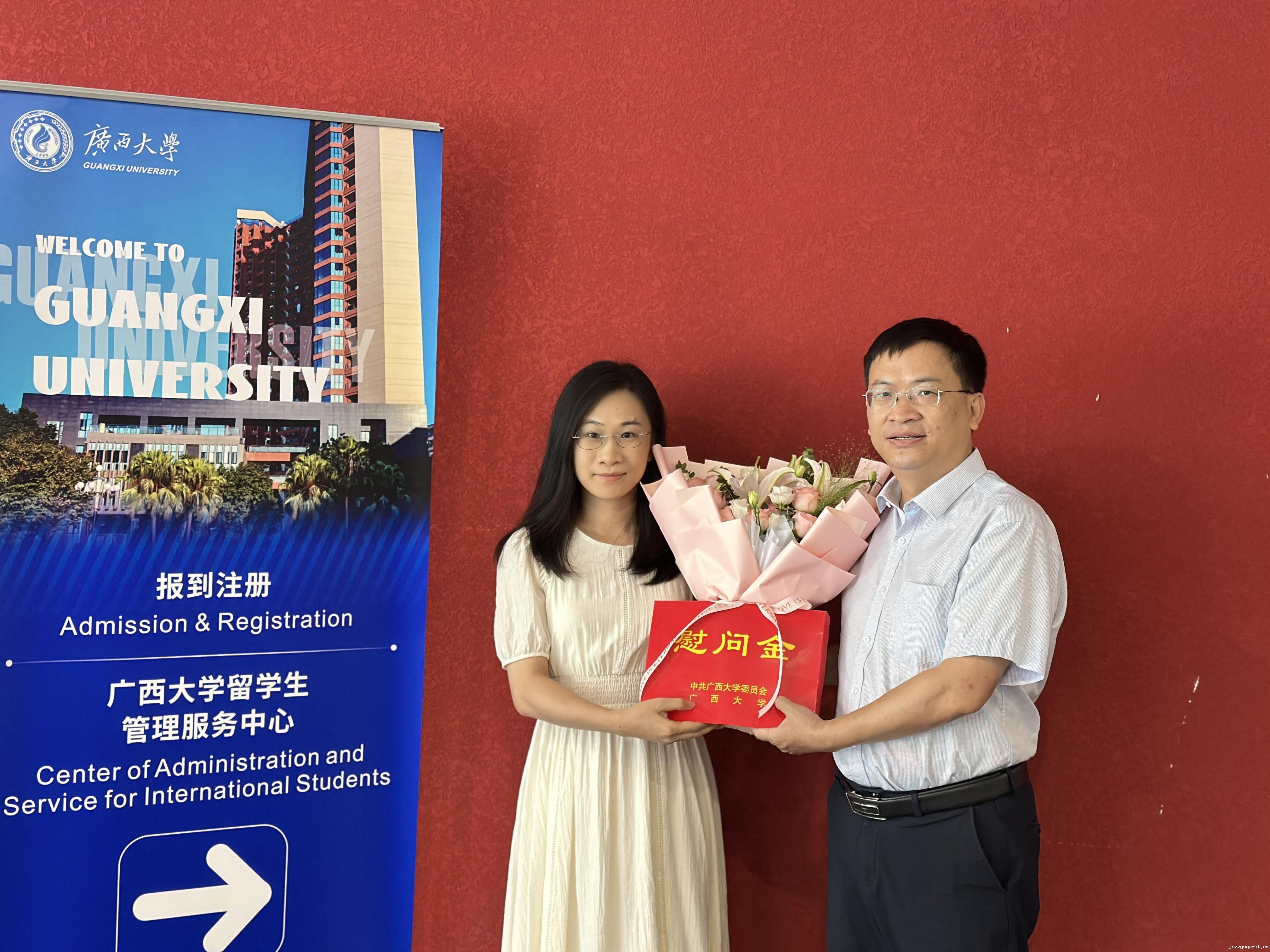 9月9日上午,留服中心主任廖文丹、副主任陈碧兰亲切慰问在新生注册报到一线辛勤工作的教师代表,并向他们致以教师节的亲切问候。