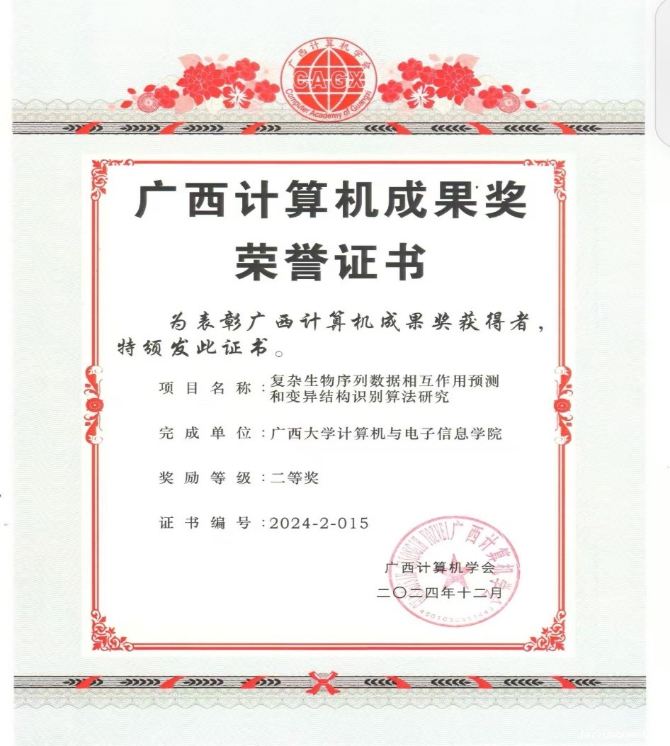 国家高性能计算中心南宁分中心成员、taptap苹果安装计算机与电子信息学院方辉、陈丹阳、钟诚、马汇东、孙辉、唐春艳、杨锋、何浩发、李敏等师生长期致力于研究运用计算科学、智能科学、数据科学技术对生物医学大数据计算挖掘分析及应用,取得了系列原创性科学发现,其研究成果“复杂生物序列数据相互作用预测和变异结构识别算法研究”经同行专家评审,荣获2024年度广西计算机学会成果奖二等奖。