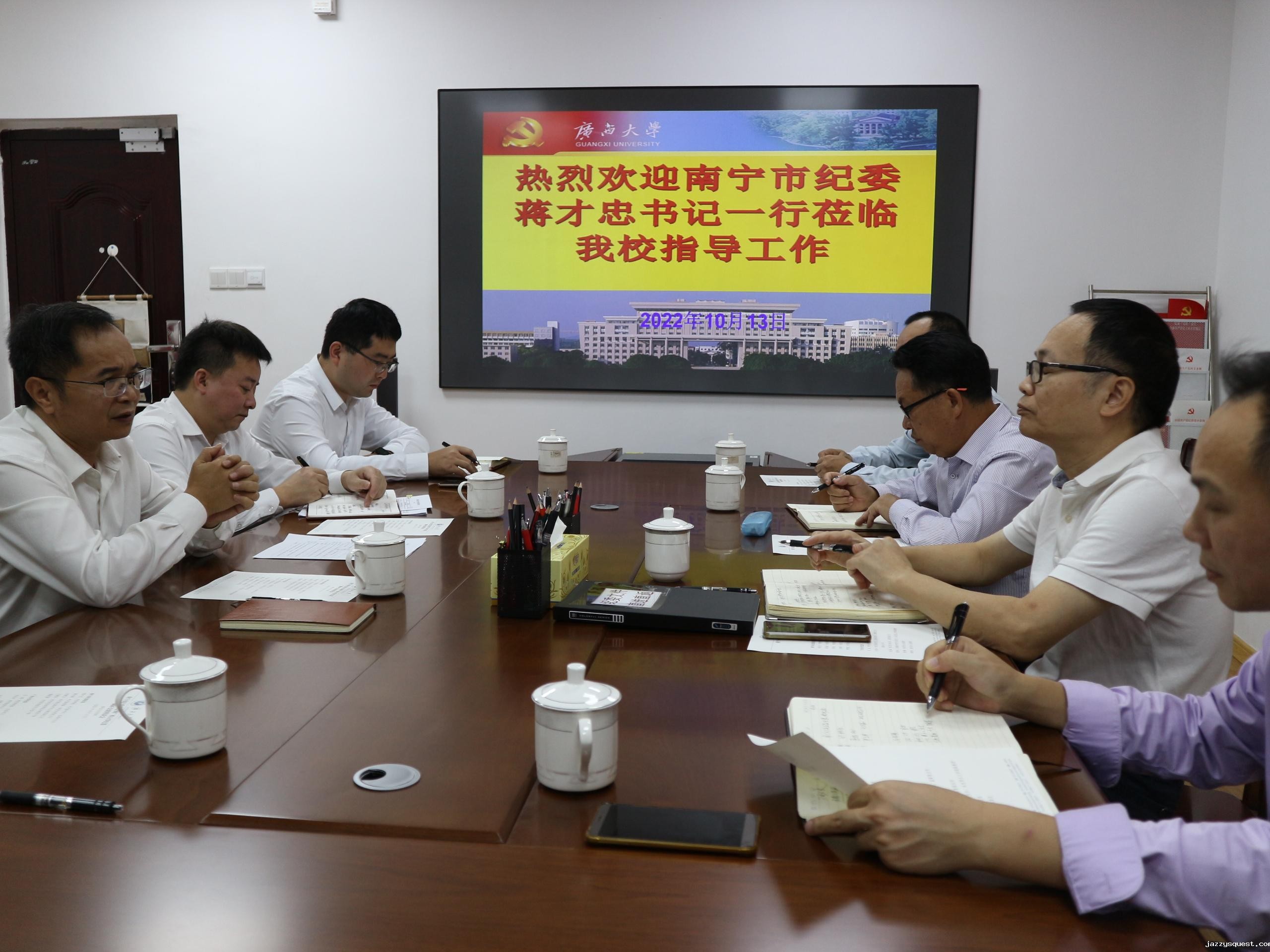 10月13日,南宁市委常委、市纪委书记、监委代主任蒋才忠一行5人来我校调研,双方在君武馆110会议室开展廉政文化研究座谈交流。我校党委常委、纪委书记吕逸,校纪委办公室、廉政研究中心、马克思主义学院相关人员参加会议。