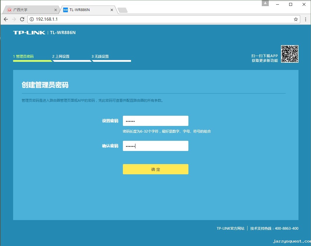 2. 打开浏览器,在地址栏内输入路由器地址192.168.1.1回车。在设置好路由器的登录密码后,确定。