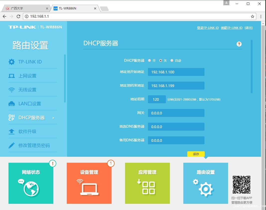 6. 点击左侧“DHCP服务器”,在DHCP服务器选择“关”,设置完毕后点击“保存”。