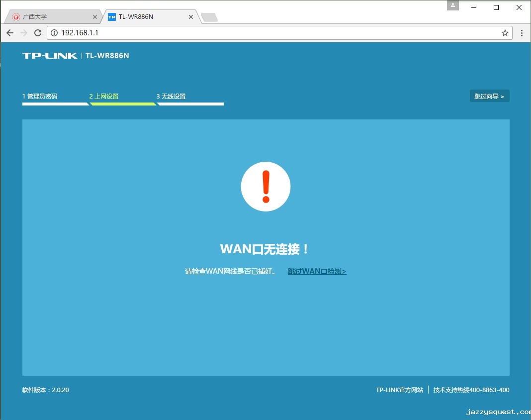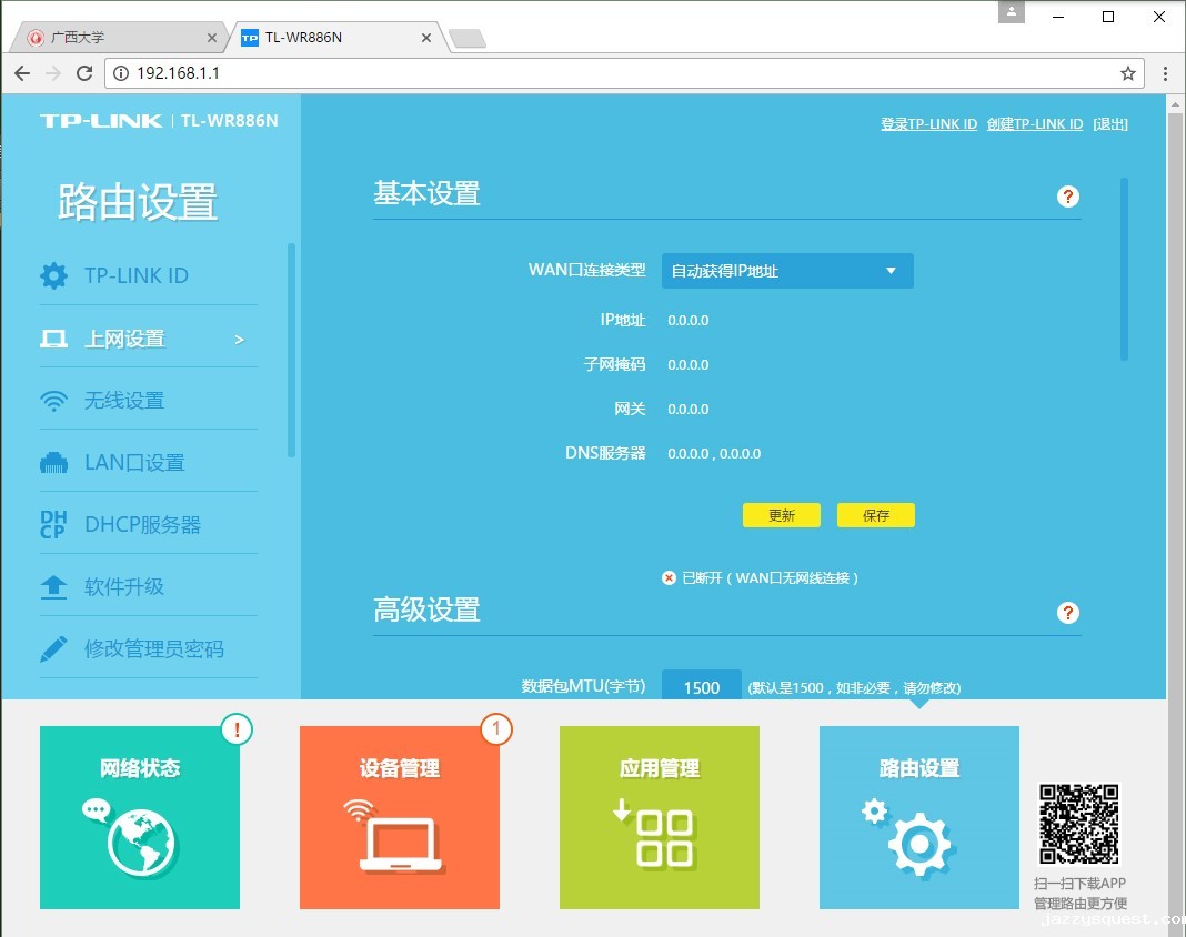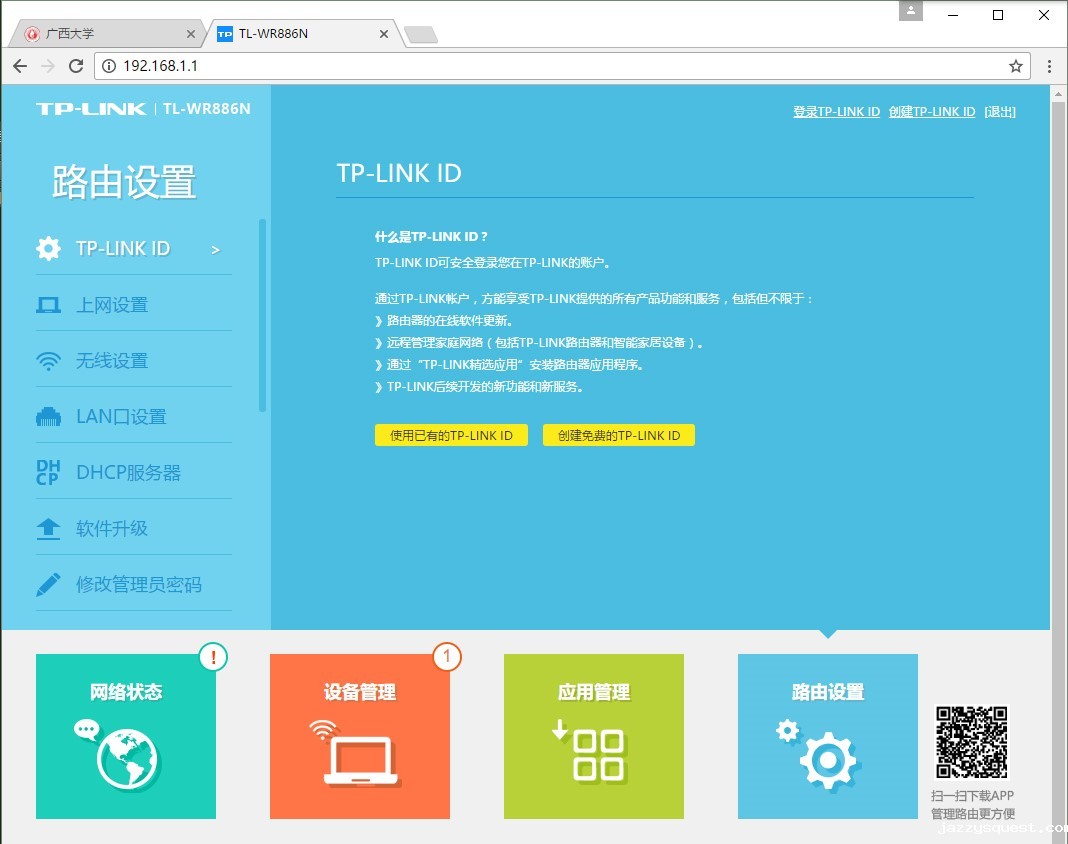 1. 连接:将网线连接起电脑和路由器,路由器端选择接任意一个lan口即可,打开浏览器,输入路由器的地址,不同的路由器有着不同的地址,(tp-link:192.168.1.1,小米:192.168.31.1,华为:192.168.3.1,腾达:192.168.0.1,360路由器:192.168.1.1水星Mercury:192.168.1.1,磊科:192.16.1.1)具体详情请看路由器背面的说明。这里用tp-ling路由器为例.