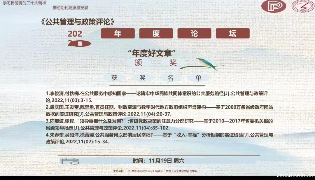 本次《公共管理与政策评论》年度好文章评选活动自2022年11月初正式启动,对《公共管理与政策评论》2022年刊发的全部72篇文章进行评选。经编辑部推荐初选和专家终评委员会评审,最终评选出4篇年度好文章。