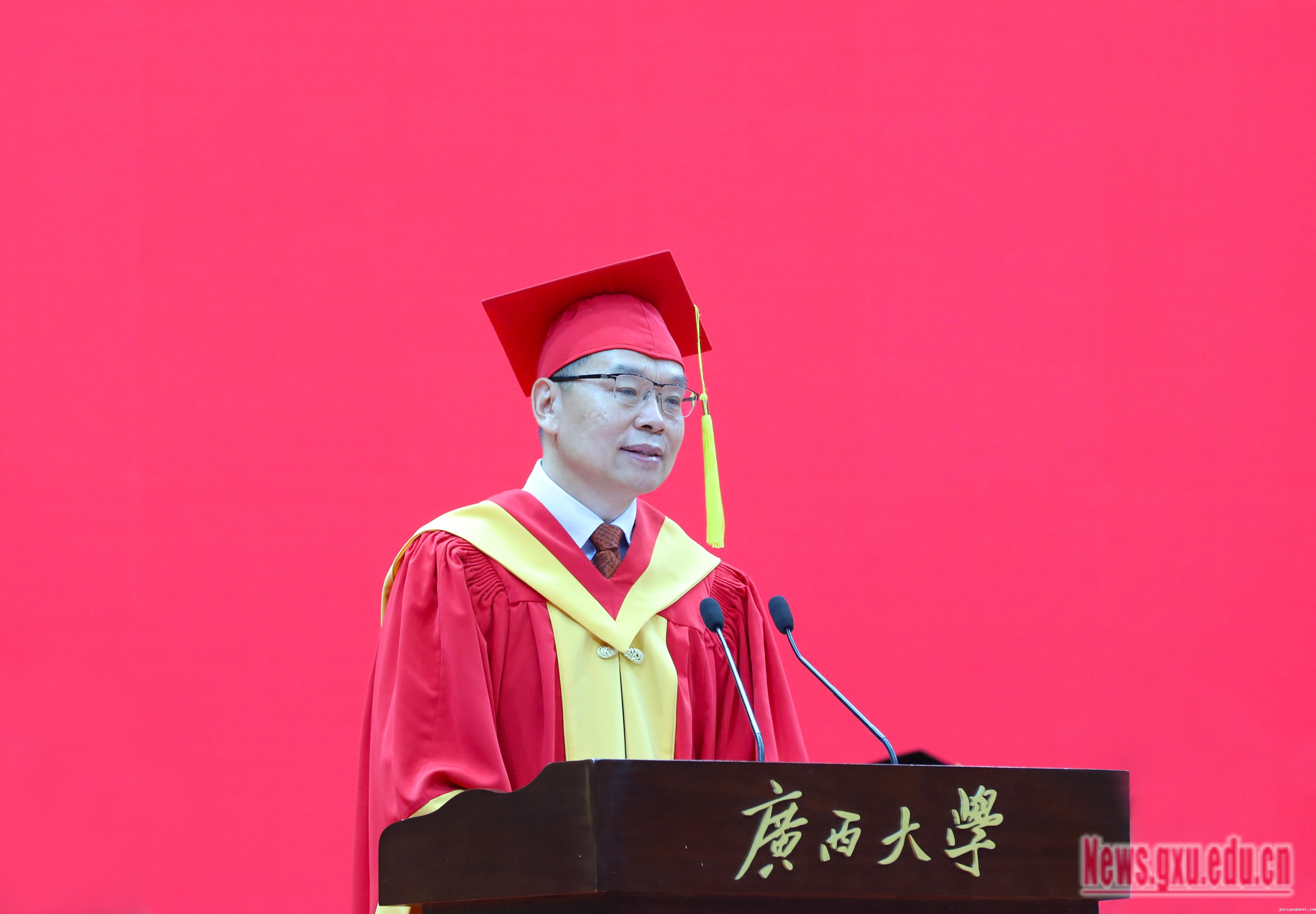 在雄壮激昂的国歌奏唱中,2023届本科生毕业典礼暨学位授予仪式拉开帷幕。韩林海作题为《气贯虹霓 跨越山海》的讲话,他代表学校向全体毕业生表示热烈的祝贺,向辛勤培育学生的家长们、倾心教导学生的老师们、关心和帮助学生的亲人朋友致以衷心的感谢,为加入中国共产党、继续深造、入选研究生支教团、成为定向选调生以及获校长奖学金、优秀毕业生、“中国大学生自强之星”“宝钢优秀学生特等奖”“广西首位‘00后’造血干细胞捐献者”等荣誉的优秀青年点赞。
