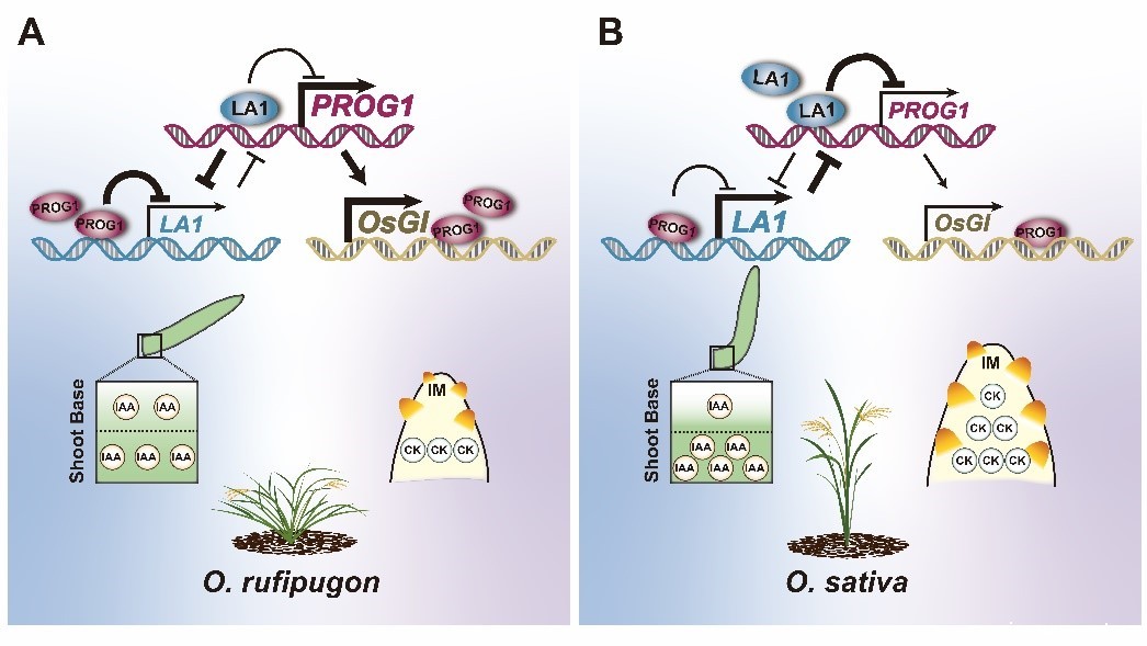 研究发现,PROG1蛋白能结合到LA1(LAZY 1) 基因的启动子上,抑制LA1的表达,同时,LA1蛋白也能结合到PROG1基因的启动子上,抑制PROG1基因的表达。遗传证据显示,PROG1和LA1的这种相互拮抗作用共同调节了包括分蘖角和分蘖数在内的水稻株型发育;另一方面,PROG1蛋白也能结合到OsGI(OsGIGANTEA)基因间区,激活OsGI的表达,进而引起穗部细胞分裂素含量的变化,从而调节穗型的发育。因此,在水稻进化的过程中,伴随着PROG1的失活,LA1的表达会升高,导致株型从松散变紧凑,使水稻的密植成为可能,并使其更方便于收割;另一方面,PROG1的失活同时会导致OsGI的表达量下降,引起穗子变大,穗粒数变多,最终导致产量的增加。这两个因素的变化共同推进了野生稻向栽培稻的驯化过程,最终使得水稻成为当今全球最主要的粮食作物。