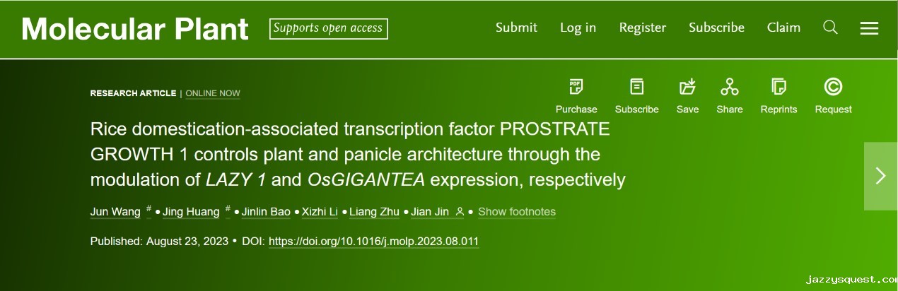 2023年8月23日,我校亚热带农业生物资源保护与利用国家重点实验室、生命科学与技术学院金健教授团队的最新研究成果“Rice domestication-associated transcription factor PROSTRATE GROWTH 1 controls plant and panicle architecture through the modulation of LAZY 1 and OsGIGANTEA expression,respectively”在Molecular Plant(中科院一区,影响因子27.5)在线发表,揭示了进化过程中水稻株型和穗型变化背后的分子机理。