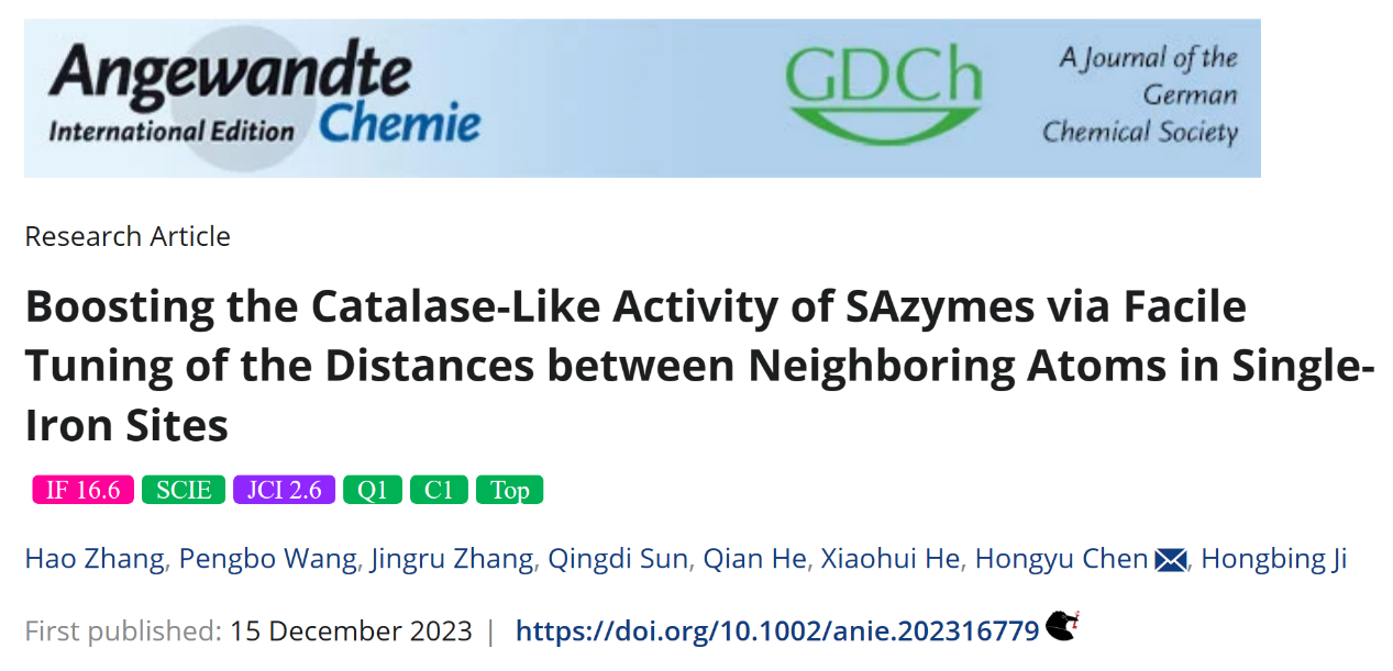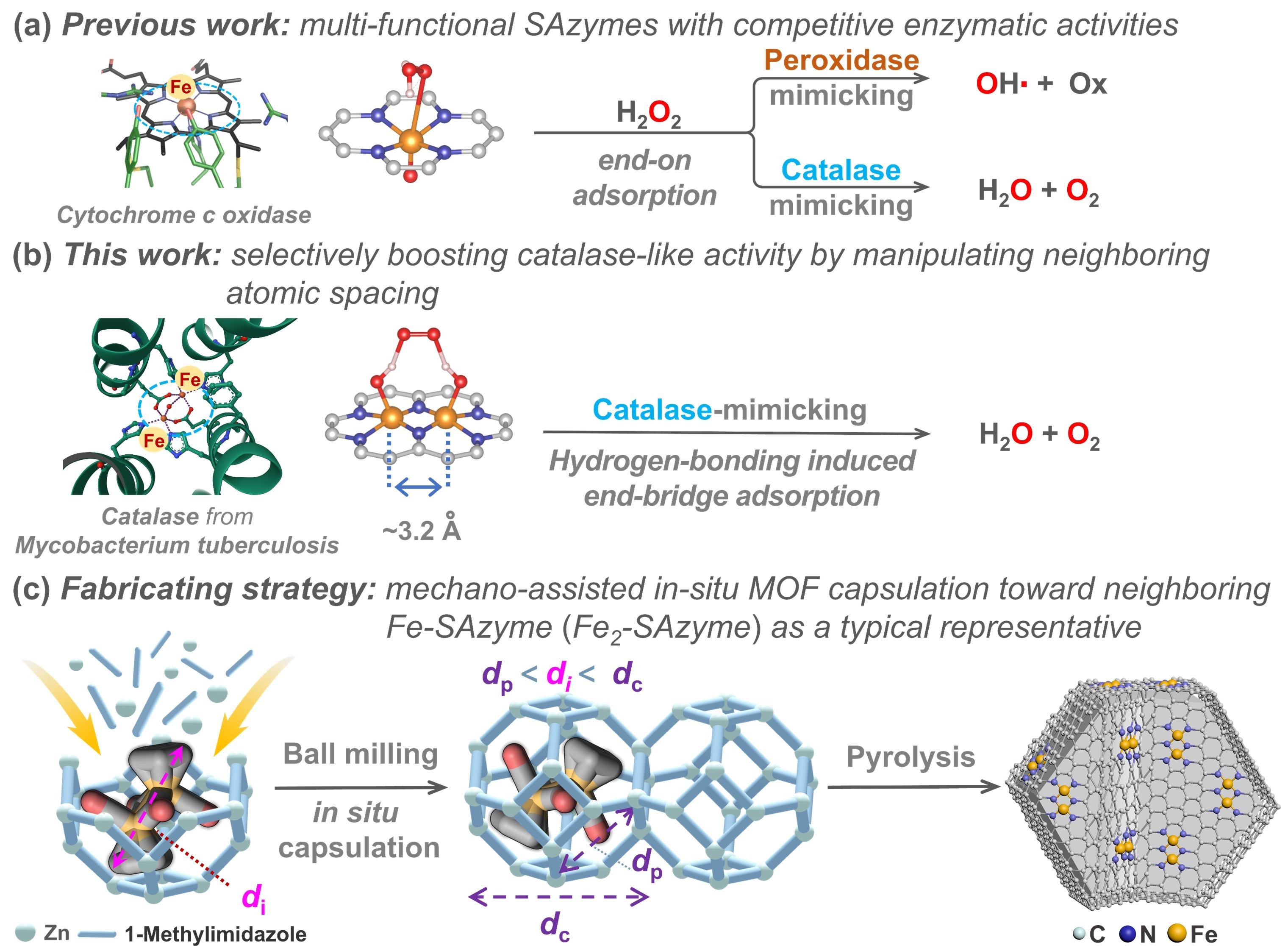 近日,我校王双飞院士团队“植物纤维清洁分离转化与纸基功能材料绿色制备”课题组陈虹宇副教授与浙江工业大学纪红兵教授在单原子纳米酶仿生催化重要研究领域取得新的进展。该研究基于天然酶结构特性,利用机械辅助原位MOF封装策略,构建类双星体结构的单原子铁纳米酶,从原子尺度为解决多功能纳米酶活性调控手段欠缺的难题提供了全新思路与策略。相关研究成果以Boosting the Catalase-Like Activity of SAzymes via Facile Tuning of the Distances between Neighboring Atoms in Single-Iron Sites为题发表于化学领域国际顶级综合期刊Angewandte Chemie,同时获邀封面,并受邀在官方WileyChem微信公众号上发表评述。该论文实现了轻工与食品工程学院以第一通讯单位在Angewandte Chemie发表论文的突破,也是轻工技术与工程学科在国际具有重要影响力期刊上发表高水平研究成果的又一重大突破。