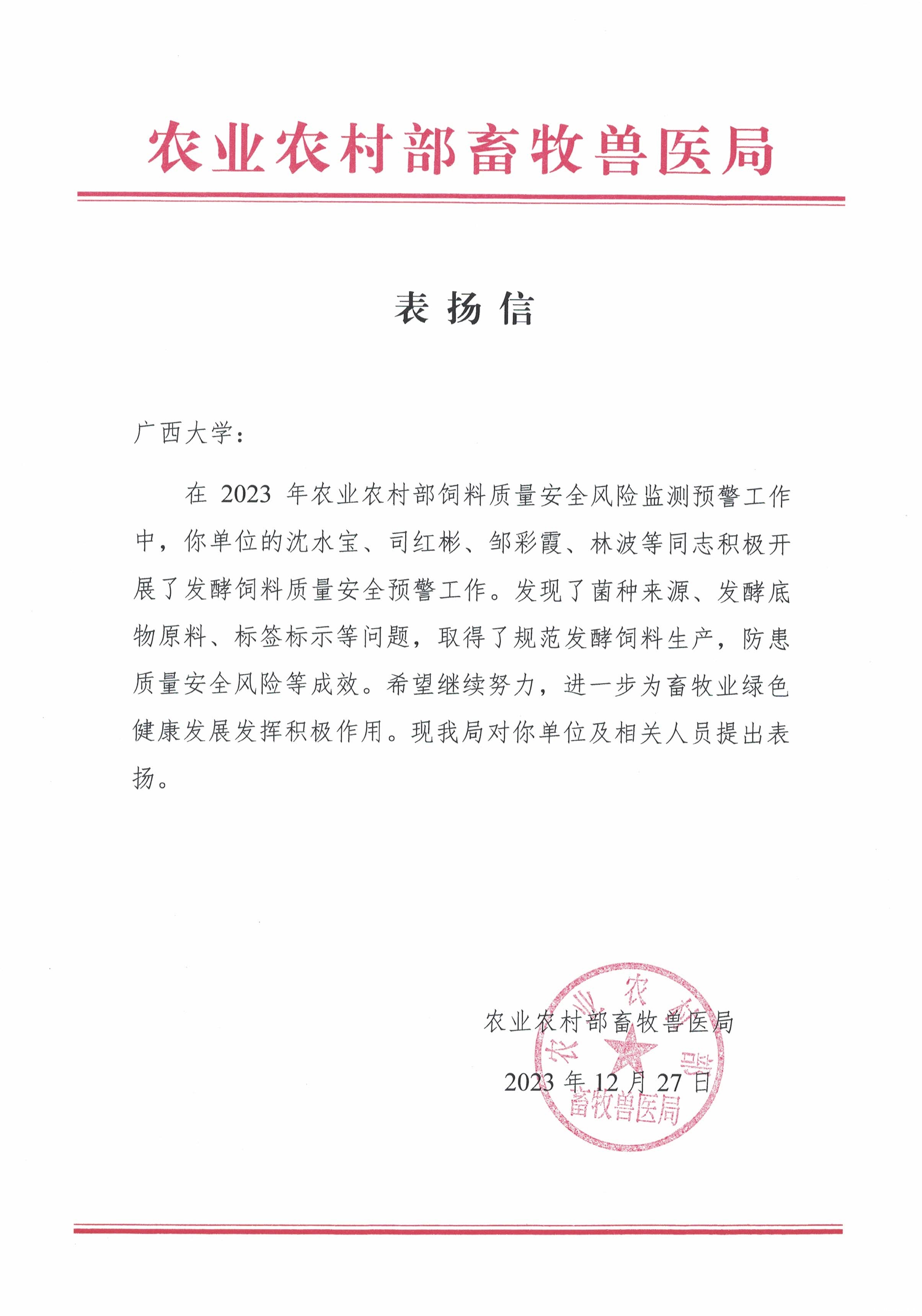近日,我校收到农业农村部畜牧兽医局的表扬信。对我校农牧产业发展研究院沈水宝、司红彬,动物科学技术学院邹彩霞、林波等四位老师在2023年农业农村部饲料质量安全风险监测预警工作中的突出表现给予高度认可。四位老师积极开展发酵饲料质量安全预警工作,发现了菌种来源、发酵底物原料、标签标示等问题,取得了规范发酵饲料生产、防患质量安全风险等成效。为强化饲料质量安全监管,提高畜产品质量安全水平,促进畜牧业绿色健康发展发挥了积极作用。