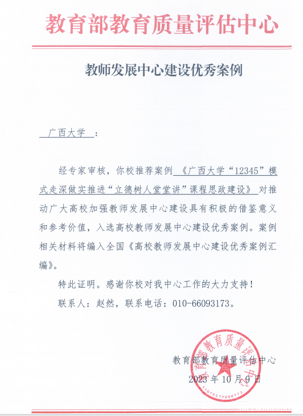 学校课程思政改革经验入选教育部教育质量评估中心《高校教师发展中心建设优秀案例汇编》;获自治区党委主题教育办推荐为典型案例;获《广西教育信息》报道。