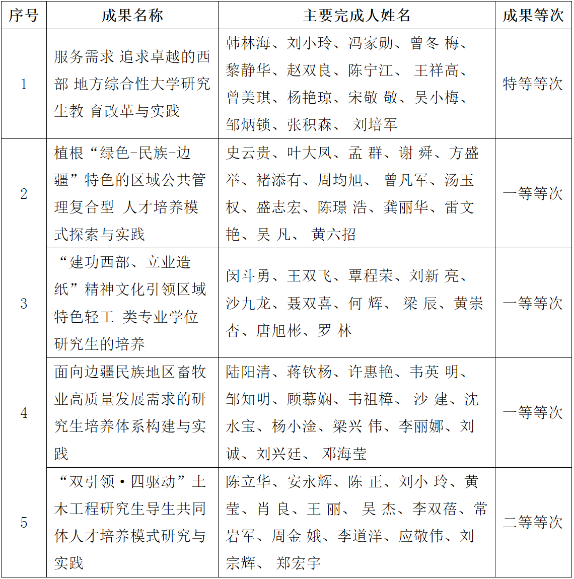 学校获2023年广西高等教育(研究生)自治区级教学成果奖5项,其中特等等次1项,一等等次3项,二等等次1项,位列全区高校第一。校党委副书记、校长韩林海主持的成果《服务需求 追求卓越的西部地方综合性大学研究生教育改革与实践》获得全区研究生教学成果奖的唯一特等奖。
