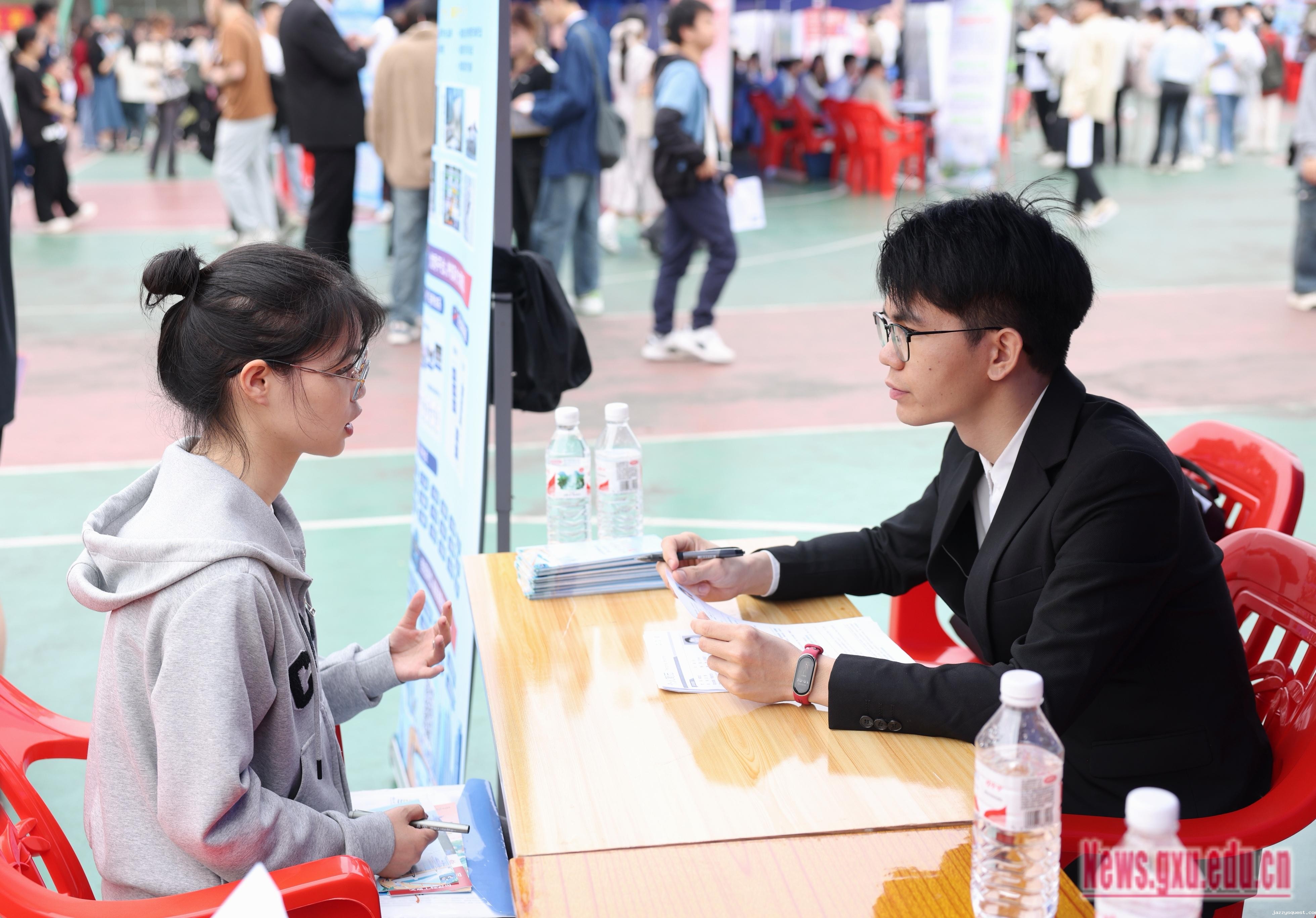 化学化工学院博士研究生岳同学表示:“参加双选会的用人单位与我的专业匹配度高,我已和广西区内一家事业单位现场达成了就业意向。感谢学校提供的暖心就业服务和老师们的现场指导,让我们不出校门就能获得高质量的就业机会。”