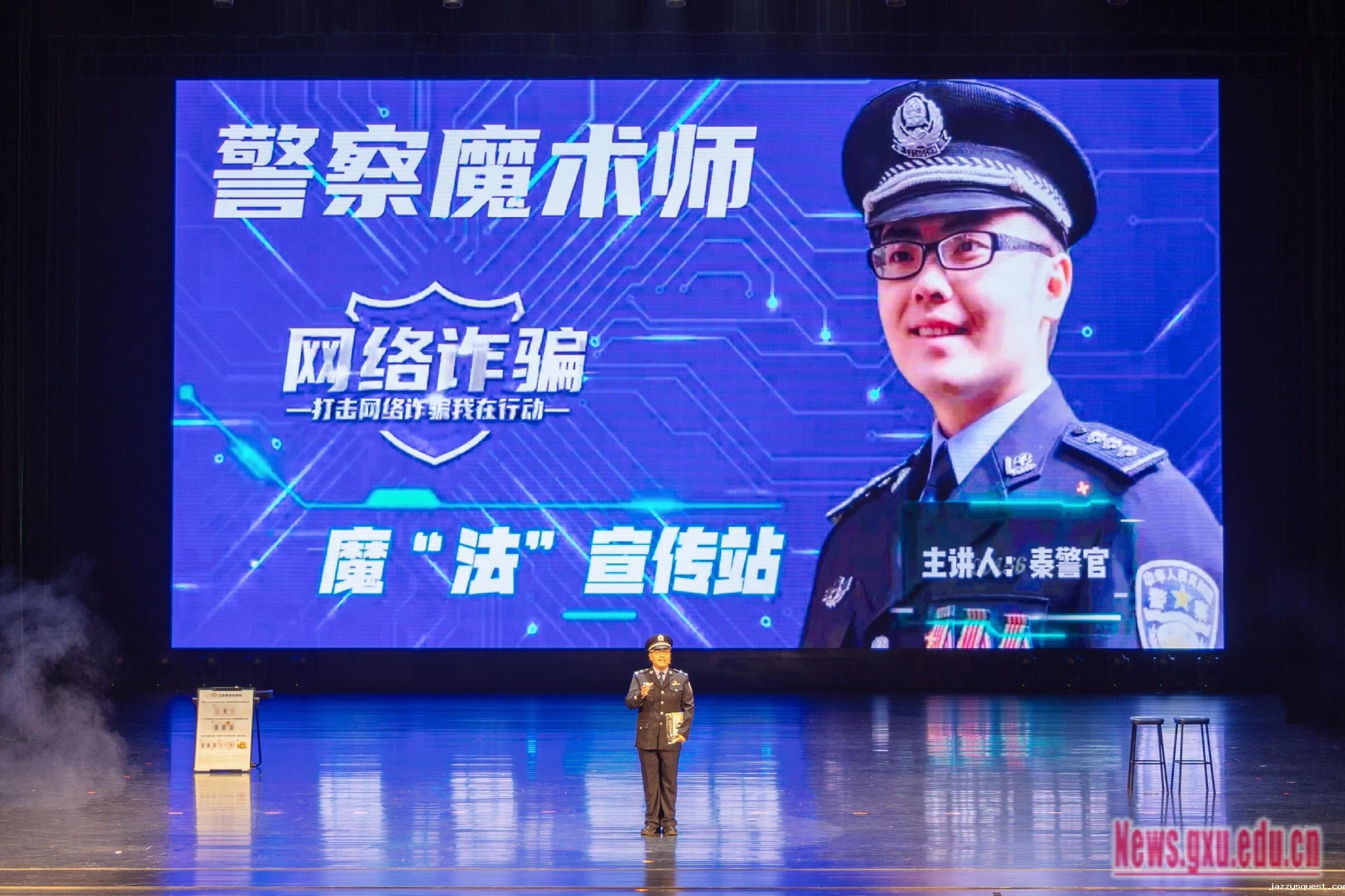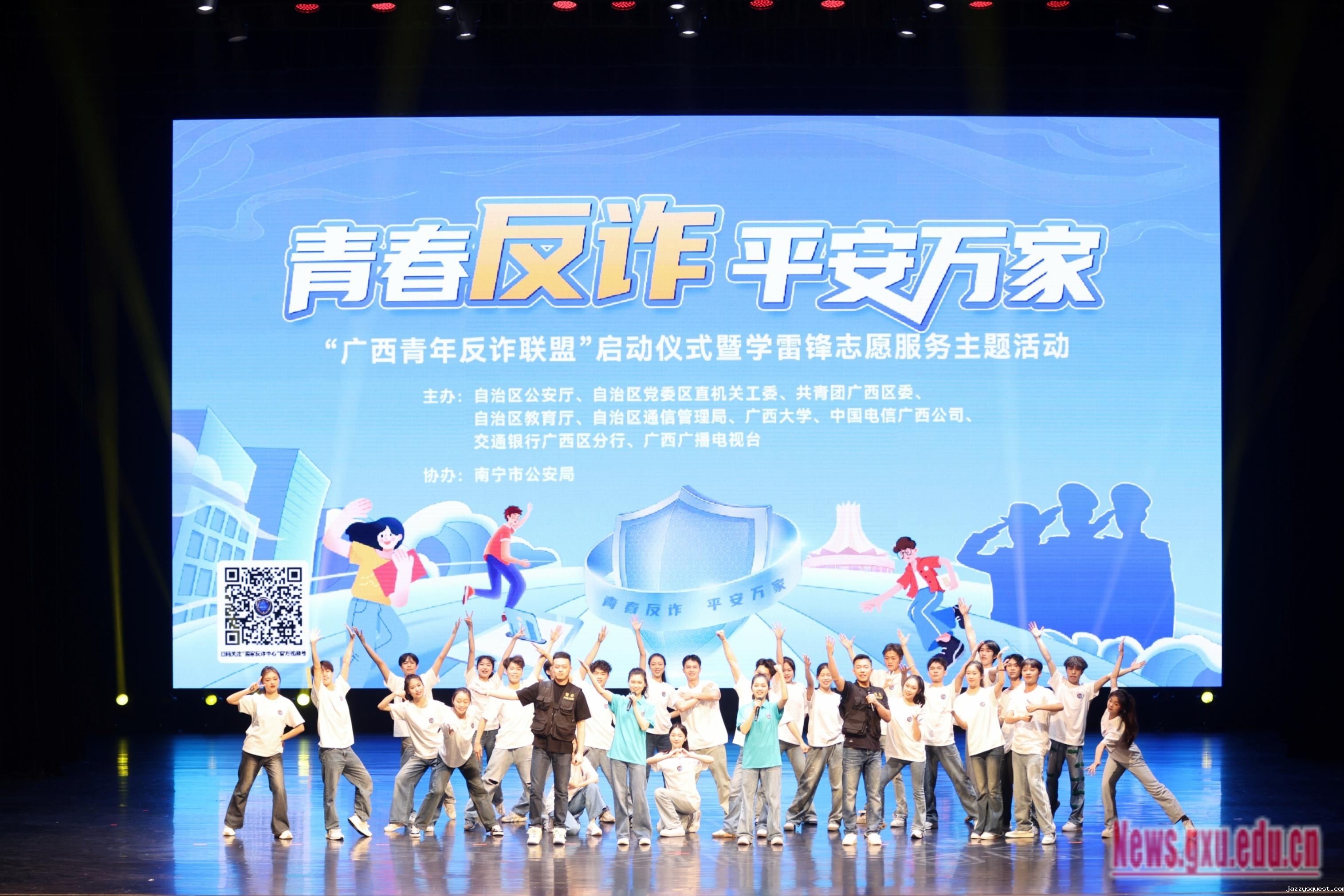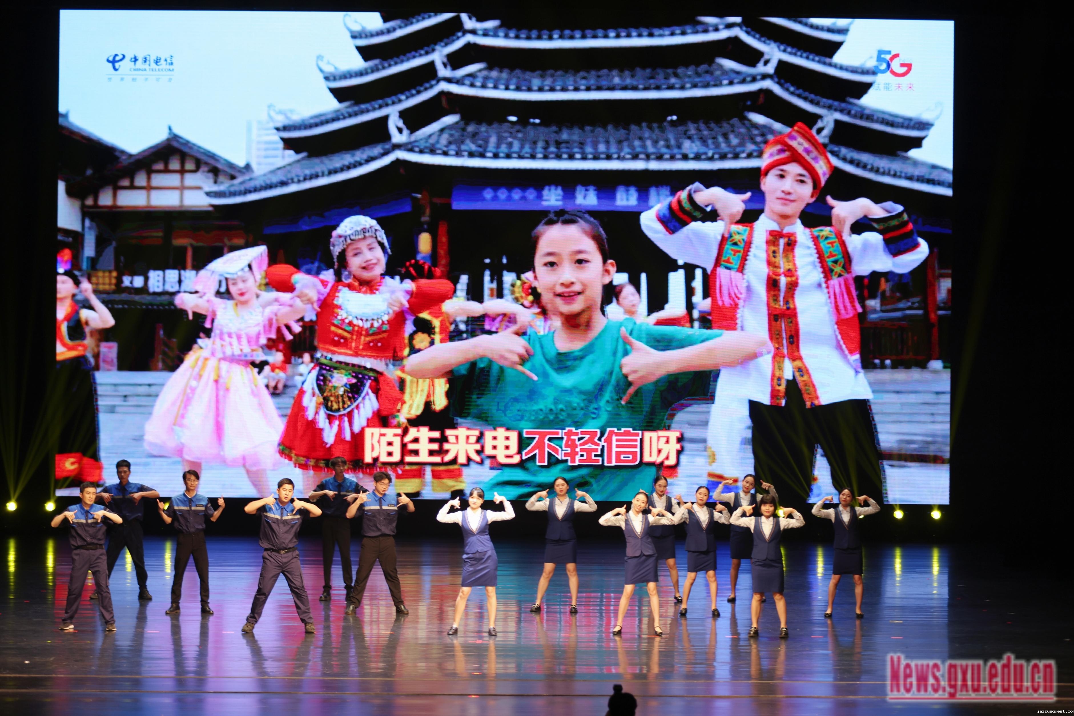 南宁市公安局民警通报了近期诈骗案件类型及典型案例。我校青年代表蓝同学宣读广西青年反诈联盟倡议书,号召大家携手,以广西青年反诈联盟为平台,为构建安全和谐的社会环境、建设平安广西贡献青春力量。我校学生与自治区公安厅等单位联合带来了歌曲、魔术、舞蹈等多形式的反诈节目,生动宣传防范电信网络诈骗知识。