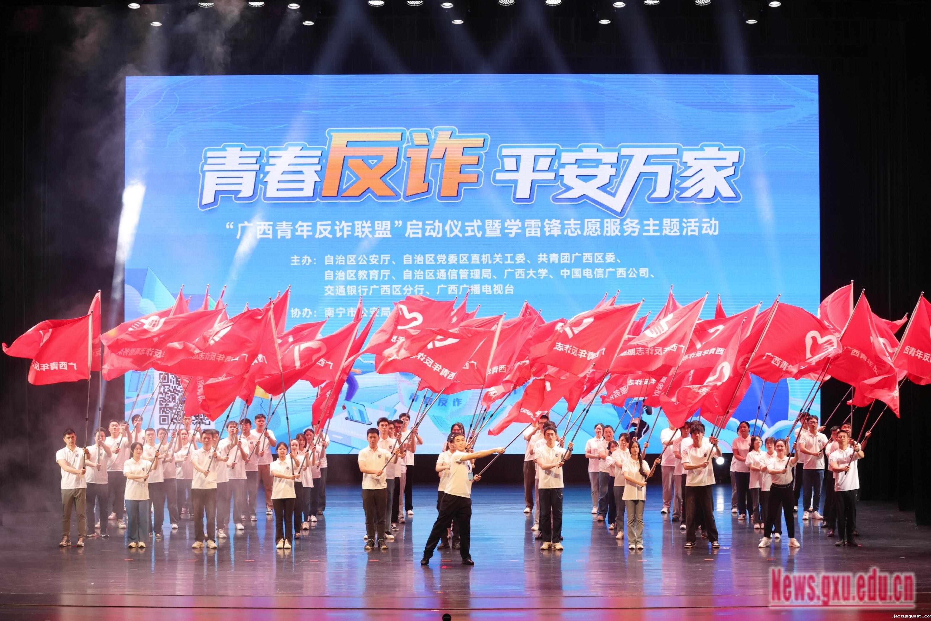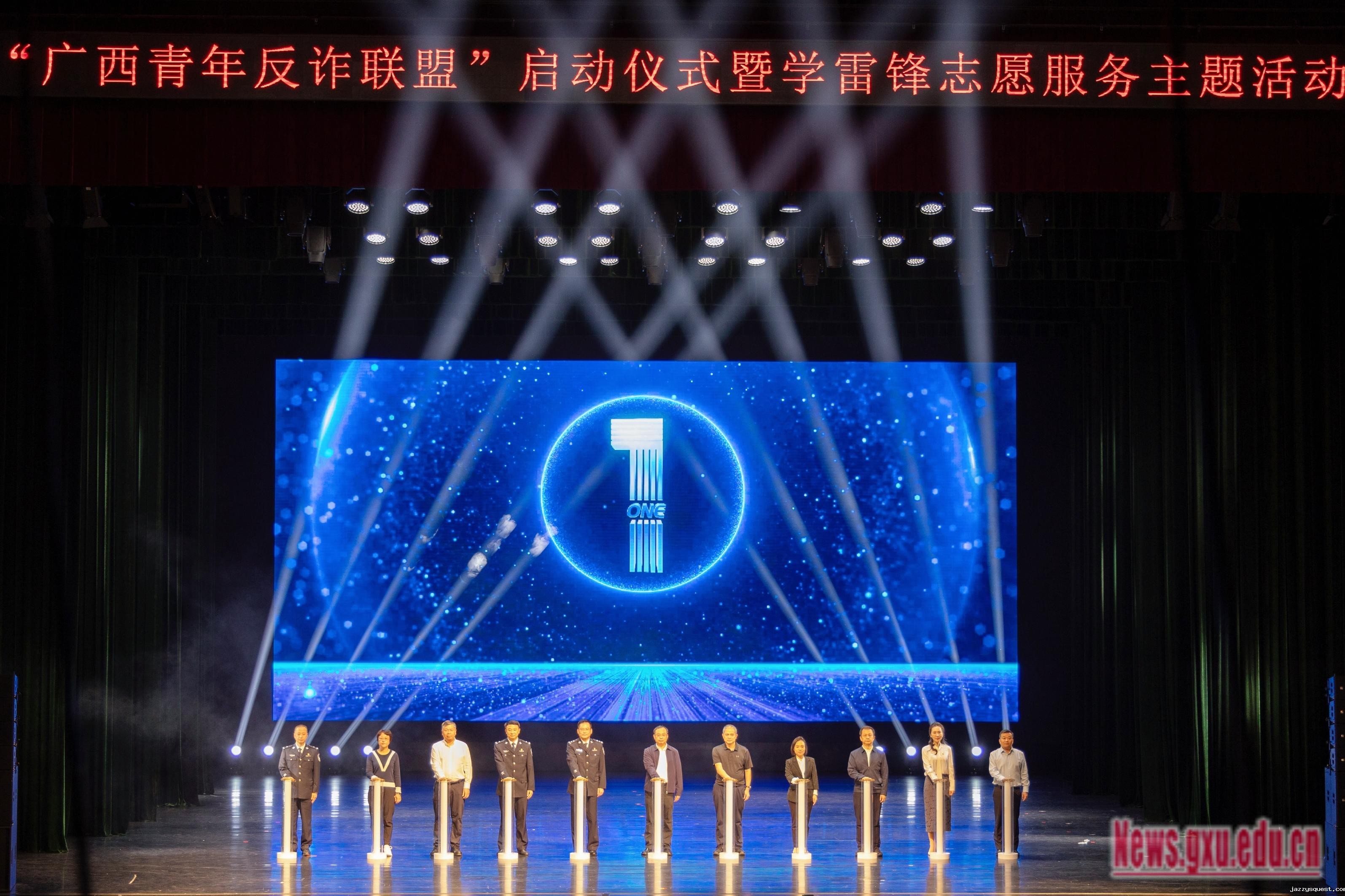 启动仪式上,出席活动的领导在舞台上同时按下启动按钮,标志着“广西青年反诈联盟”正式启动,并为驻邕高校及相关企事业单位的55名志愿者代表授旗。