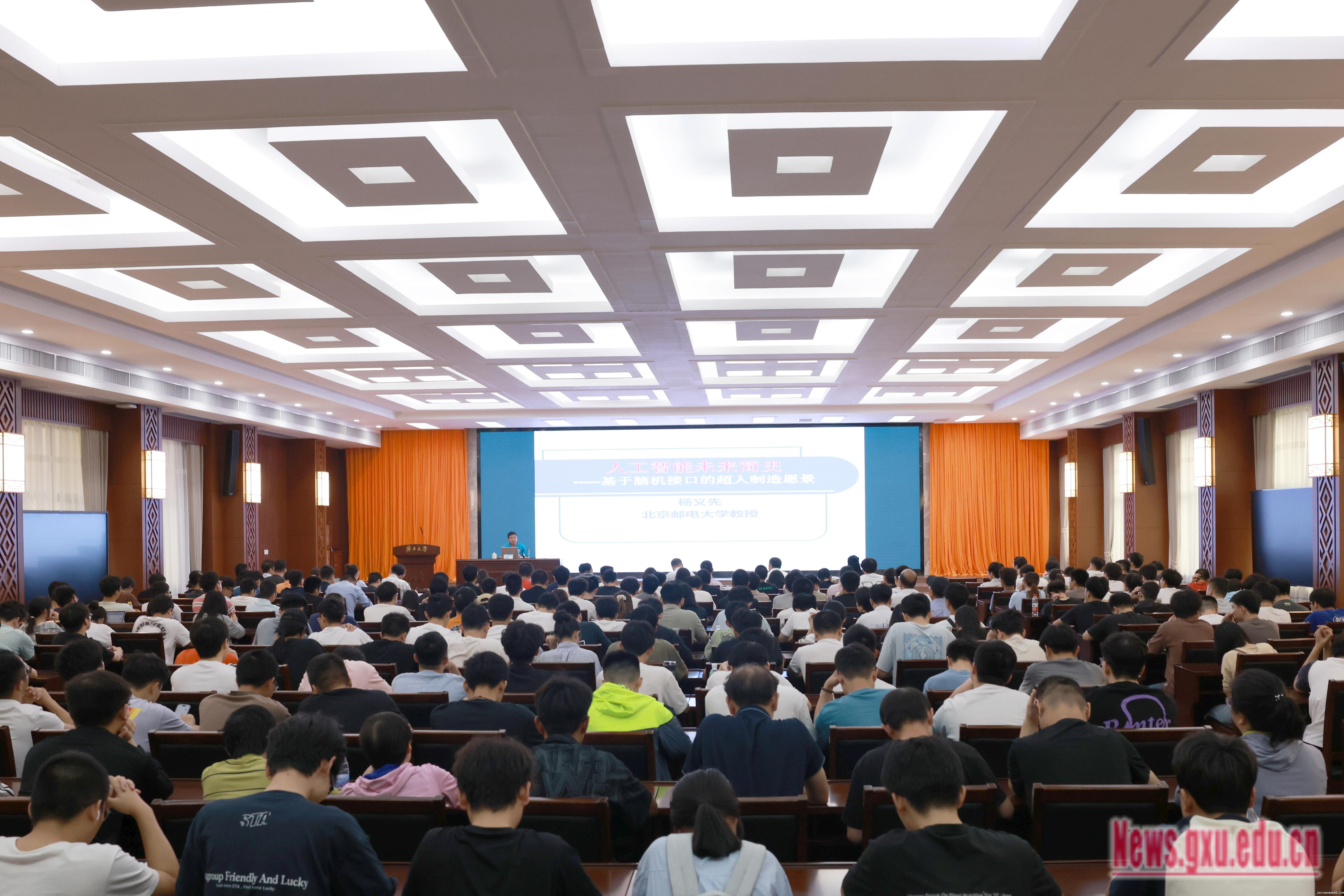 报告中,杨义先介绍了人工智能未来的发展愿景,指出在当下外延型人工智能蓬勃发展的时代,以脑机接口为代表的内涵型人工智能具有巨大的潜力,并从宏观型、中观型和微观型3个方面介绍脑机接口,指出脑机接口的核心思想是包括大脑在内的神经系统类似于电脑的信息系统,各部分之间既接收和传递信息,又接受电信号的控制而执行相关命令,脑系统与机系统因此得以彼此连接。他不时与现场师生互动交流,为师生们答疑解惑。