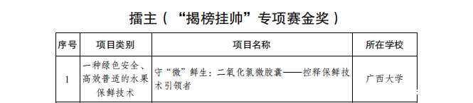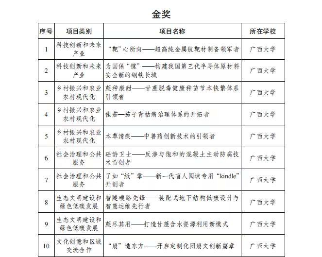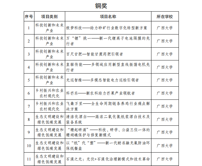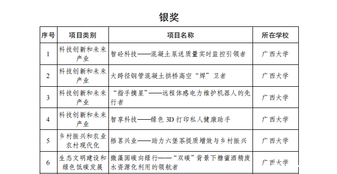 6月25日,由共青团广西区委、自治区教育厅、自治区科协、广西学联共同主办的第十一届“挑战杯”获奖名单公布,我校获金奖10项,银奖6项,铜奖11项,擂主(“揭榜挂帅”专项赛金奖)1个,金奖项目数位列全区参赛高校第一,学校获“优胜杯”和优秀组织奖。