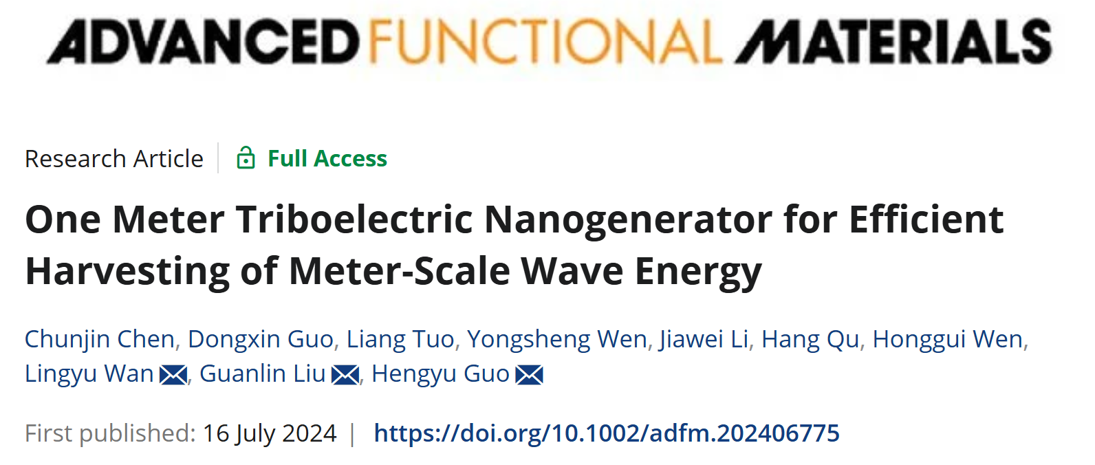 为高效采集海水表面波浪能,了解波浪与漂浮物相互作用的动力学规律是优化设计的关键。团队针对海浪的随机信号特点,引入随机波浪理论和波谱分析法,首次从统计学和能量传递的角度提出了量化评估壳体对波浪能吸收能力的结构品质因数,发展了TENG器件波物耦合适配程度的评价方法,为高效波浪能TENG器件设计和内部采能方向选择提供了基础性的指导。研究成果发表于国际知名期刊《先进科学》(Advanced Science,2024,202405165,第一作者为2021级硕士生郭东鑫,通讯作者:万玲玉、刘官林、翟俊宜)。此外,团队发现大尺寸的漂浮物有利于实际海上波浪能的转换,团队设计并制作了业内首个一米尺寸的波浪能摩擦纳米发电机,实现了60.82 µC 的单周期转移电荷和 1.76 cm −1 的摩擦层面积密度。同时,通过集成分段限位器装置来合理控制不同滑块,实现众多TENG单元之间的有效接触分离,具有高采能效率、高灵敏波浪响应能力、抗倾覆能力等优良性能。论文成果发表于国际材料知名期刊《先进功能材料》(Advanced Functional Materials, 2024, 2406775,第一作者为2021级硕士生陈春金,通讯作者:万玲玉、刘官林、郭恒宇)。