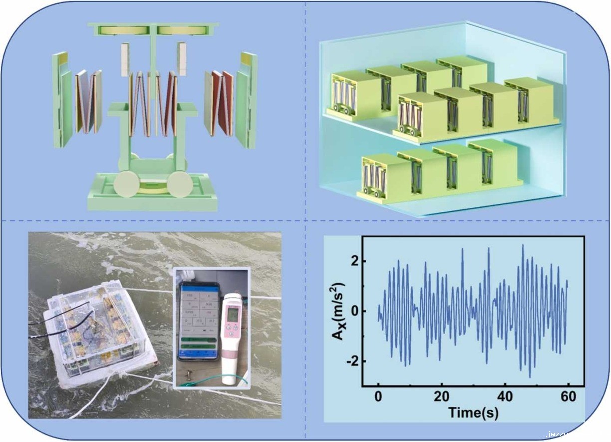 在高性能波浪能摩擦纳米发电机方面,团队提出了一种基于张拉整体结构的摩擦纳米发电机(T-TENG),可使高密度叠层单元实现高效的接触分离,实现了宽带全方位波浪能的收集,相关成果发表在国际期刊《纳米能源》(Nano Energy,2023, 117, 108906,第一作者为2021级硕士生宁恒,通讯作者为刘官林)。此外,团队还设计了一种高灵敏、模块化的穿梭式混合纳米发电机(MSHG),获得了MSHG在真实海洋环境中的实时电学输出、加速度幅值特性及最概然的输出频率。这些发现为推动纳米发电机在海洋中的应用提供重要参考,相关成果发表在国际期刊《纳米能源》(Nano Energy, 2024, 125, 109546,第一作者为2021级硕士生翟丽霞,通讯作者:万玲玉、姚辉璐、翟俊宜)。