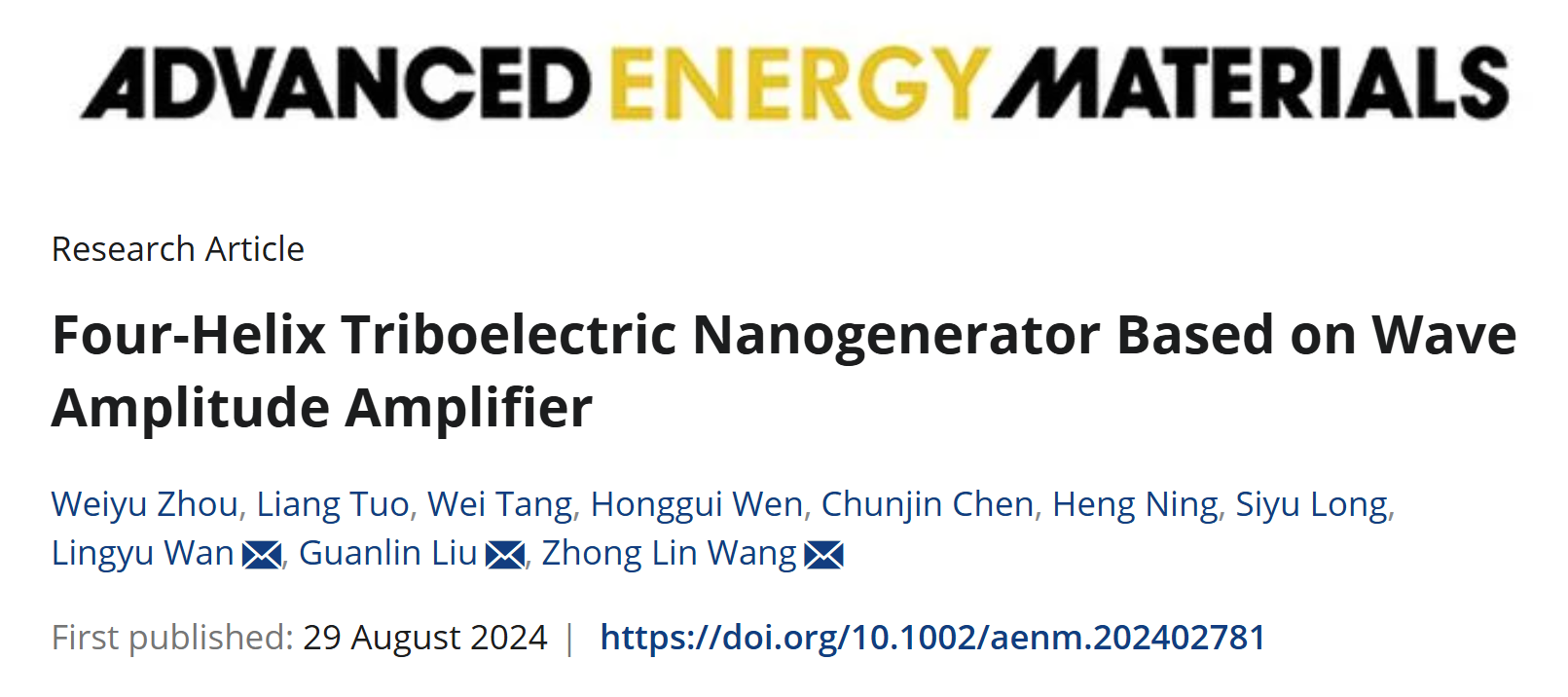 团队基于多次海洋实测发现,常规海况下实际海浪波浪振幅难以为漂浮物TENG提供足够的振幅。团队提出了海面波浪振幅放大器及轻量化的四螺旋结构TENG(FH-TENG),基于杠杆原理,将海洋中的高扭矩、低振幅运动转化为低扭矩高振幅运动,分别获得60 %振幅和235 %输出电能的提升。论文成果发表于国际知名期刊《先进能源材料》(Advanced Energy Materials, 2024, DOI: 10.1002/aenm.202402781, 第一作者为2022级硕士生周炜钰,通讯作者:万玲玉、刘官林、王中林)。