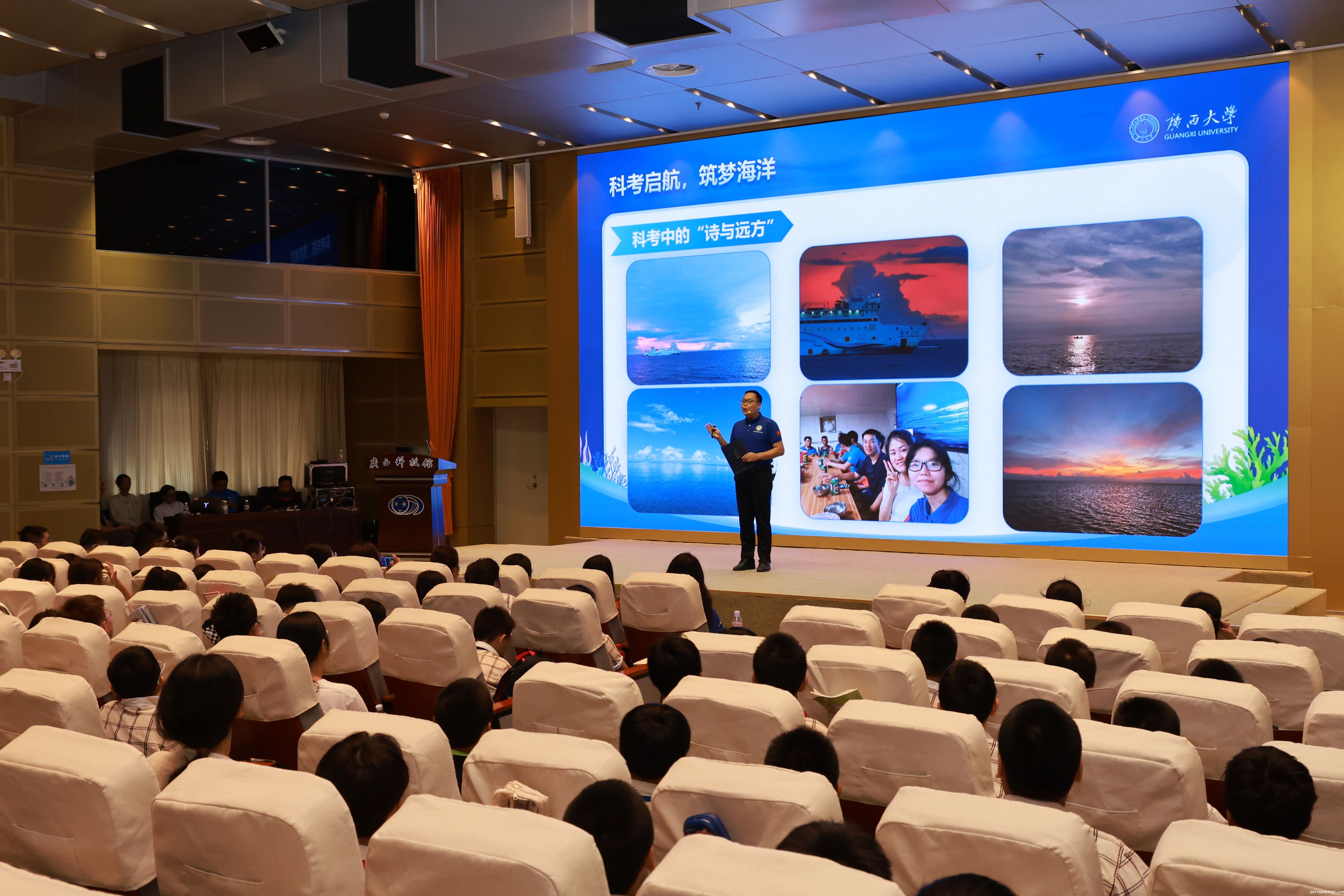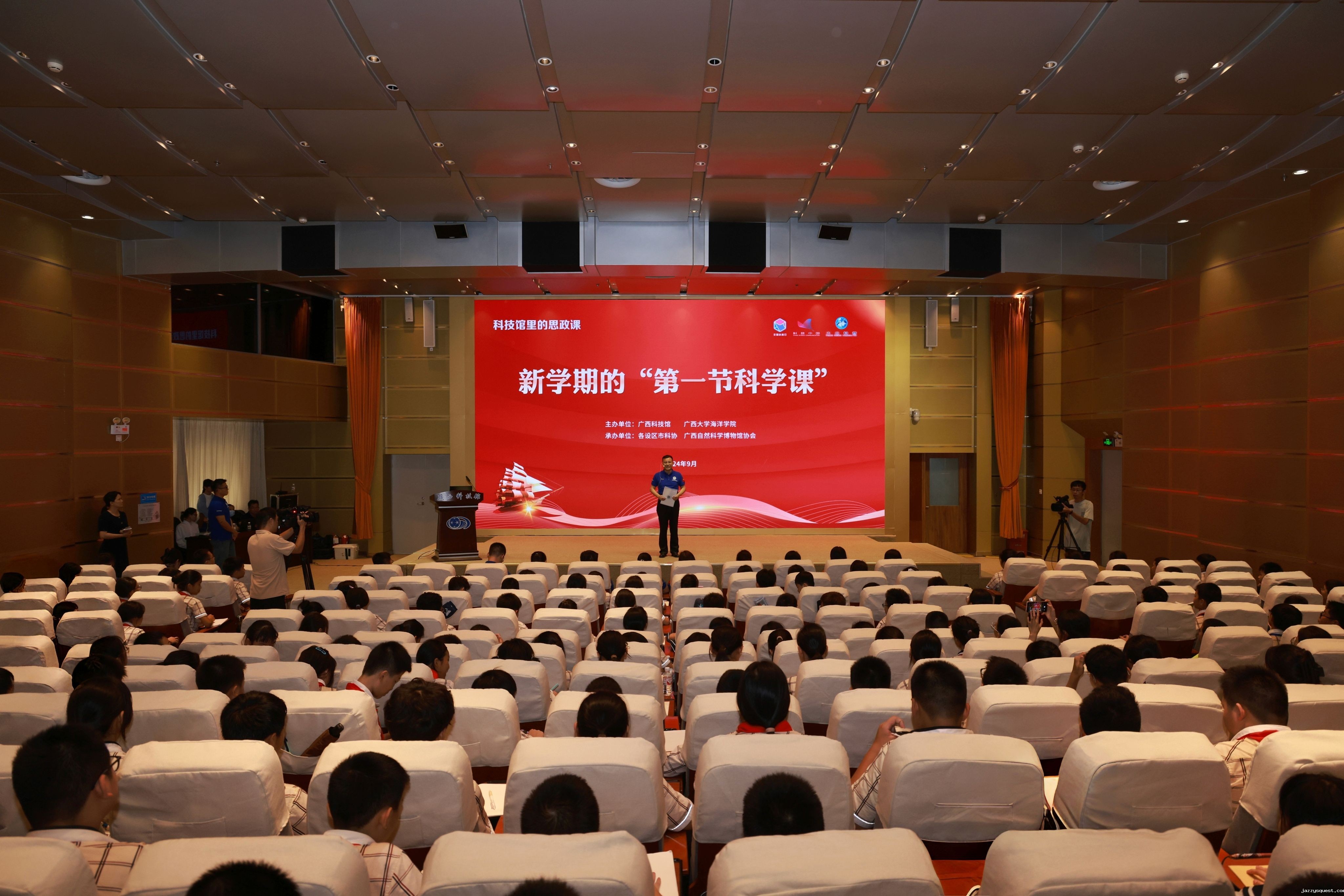 9月11日下午,由我校海洋学院“蓝色梦想”科考队成员主讲的科技馆里的思政课:新学期的“第一节科学课”在广西科技馆学术报告厅开讲。该活动由广西科技馆、我校海洋学院联合开展,是2024年全国科普日广西活动暨八桂科普大行动系列活动之一。活动采取线下线上相结合的形式开展,南宁市中山路小学近300名同学现场聆听,全区约11万名青少年同时在线观看活动直播。