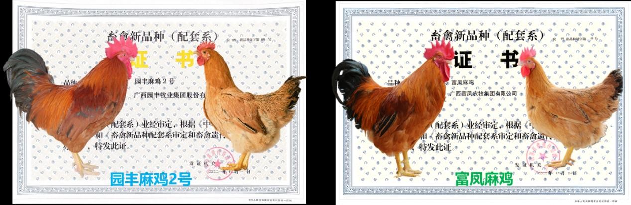 (一)获得国家级畜禽新品种2个。历时10年,国内首次利用广西麻鸡(麻羽)为主要育种素材,培育了国家级优质麻羽肉鸡新品种配套系:“园丰麻鸡2号”新品种配套系[证书编号:(农09)新品种证字第89号]和“富凤麻鸡”新品种配套系[证书编号:(农09)新品种证字第99号]。