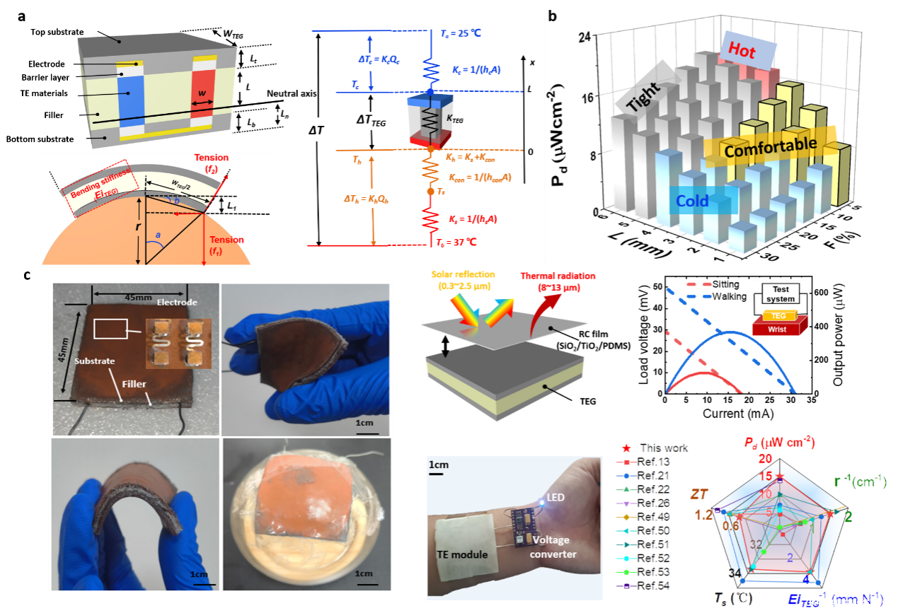 可穿戴热电发电机能够将人体热量转化为电能,为自供电的可穿戴电子设备提供了一种新的可靠的发电方法。然而,关于可穿戴热电发电机舒适度的研究一直缺乏,这是保证其可穿戴性的关键指标。研究团队通过显性公式解耦了可穿戴热电系统中舒适度(弯曲半径、皮肤温度和佩戴压力)和输出性能(包括功率和电压)之间的关系,提出了一种同时优化舒适度和输出功率的设计策略。为了验证这一设计策略,研究团队在国际上首次采用n型Mg3Bi2基和p型MgAgSb的镁基热电材料制备了表面面积为4.5×4.5cm2的可穿戴热电发电机,并在0.8kPa的佩戴压力和33℃的皮肤温度下实现了344μW(18.4μWcm-2)的输出功率(功率密度),符合实际佩戴条件。