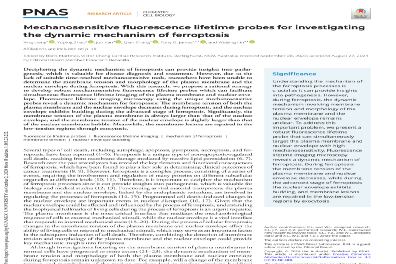 近期,我校化学化工学院探针与化学生物学团队在机械敏感荧光寿命探针研究领域获重要成果。该成果以“Mechanosensitive fluorescence lifetime probes for investigating the dynamic mechanism of ferroptosis”为题发表在国际顶级综合类期刊《美国科学院院刊》(PNAS)。我校化学化工学院博士研究生梁婞为论文第一作者,林伟英教授为通讯作者,taptap苹果安装为该论文的第一通讯单位。