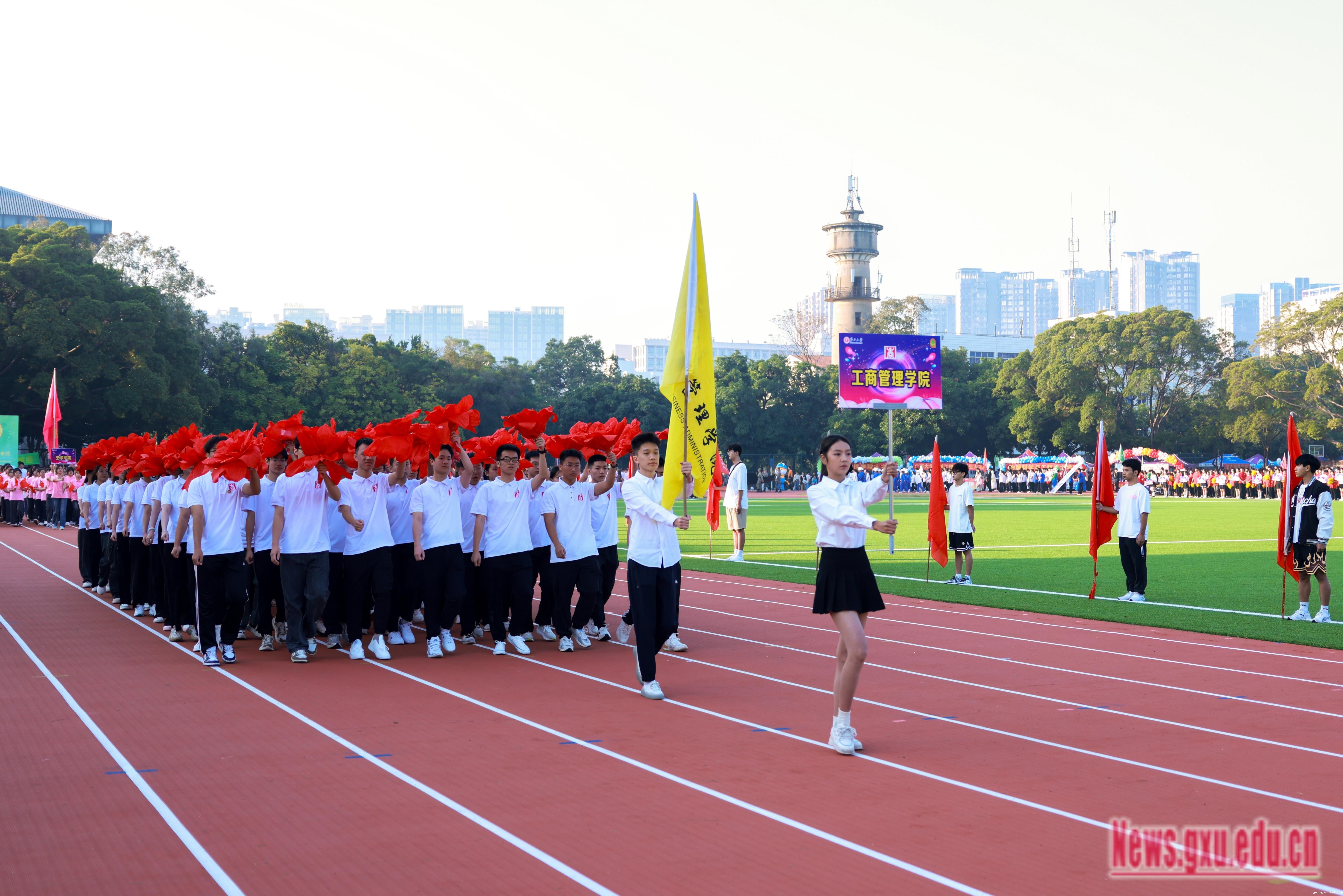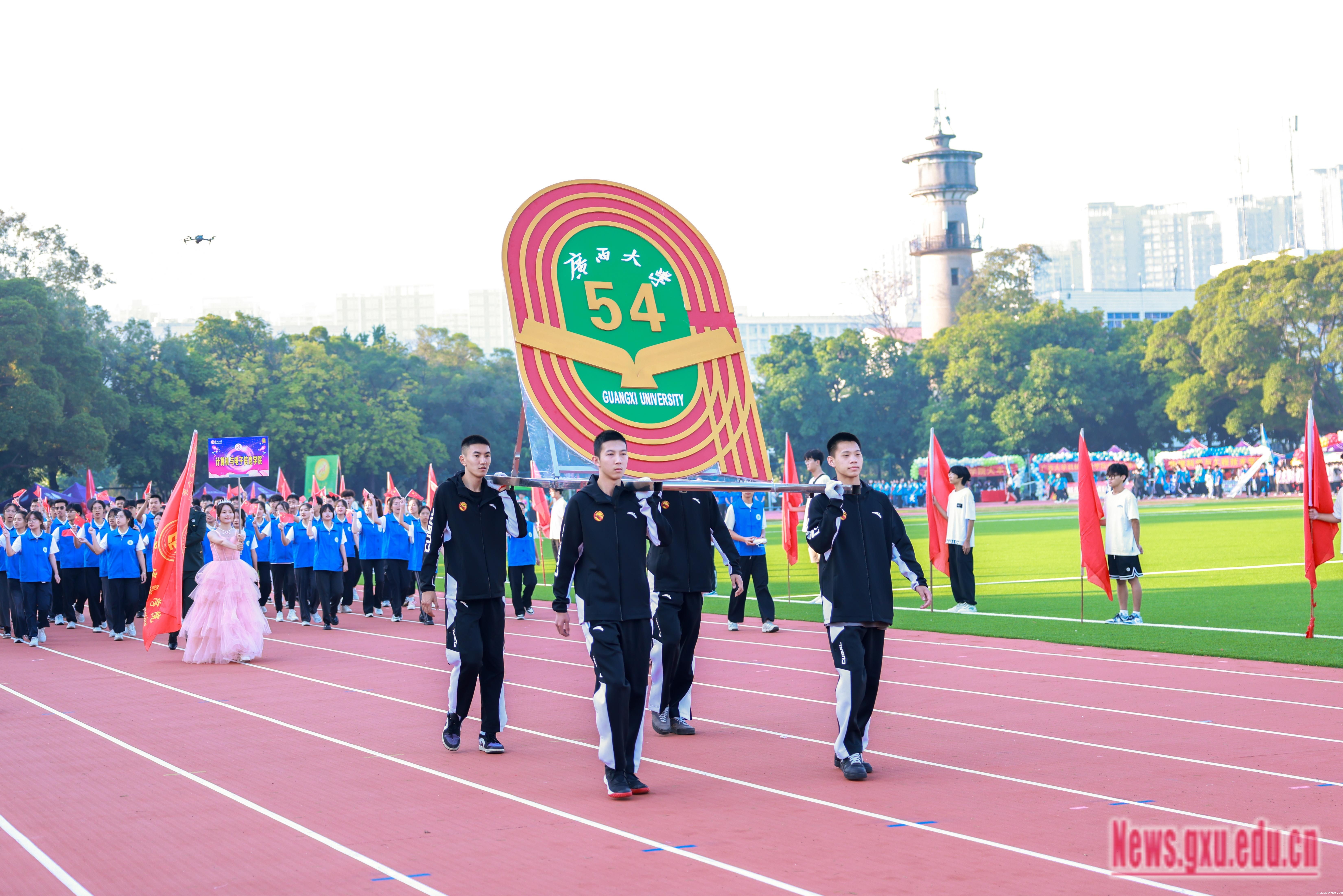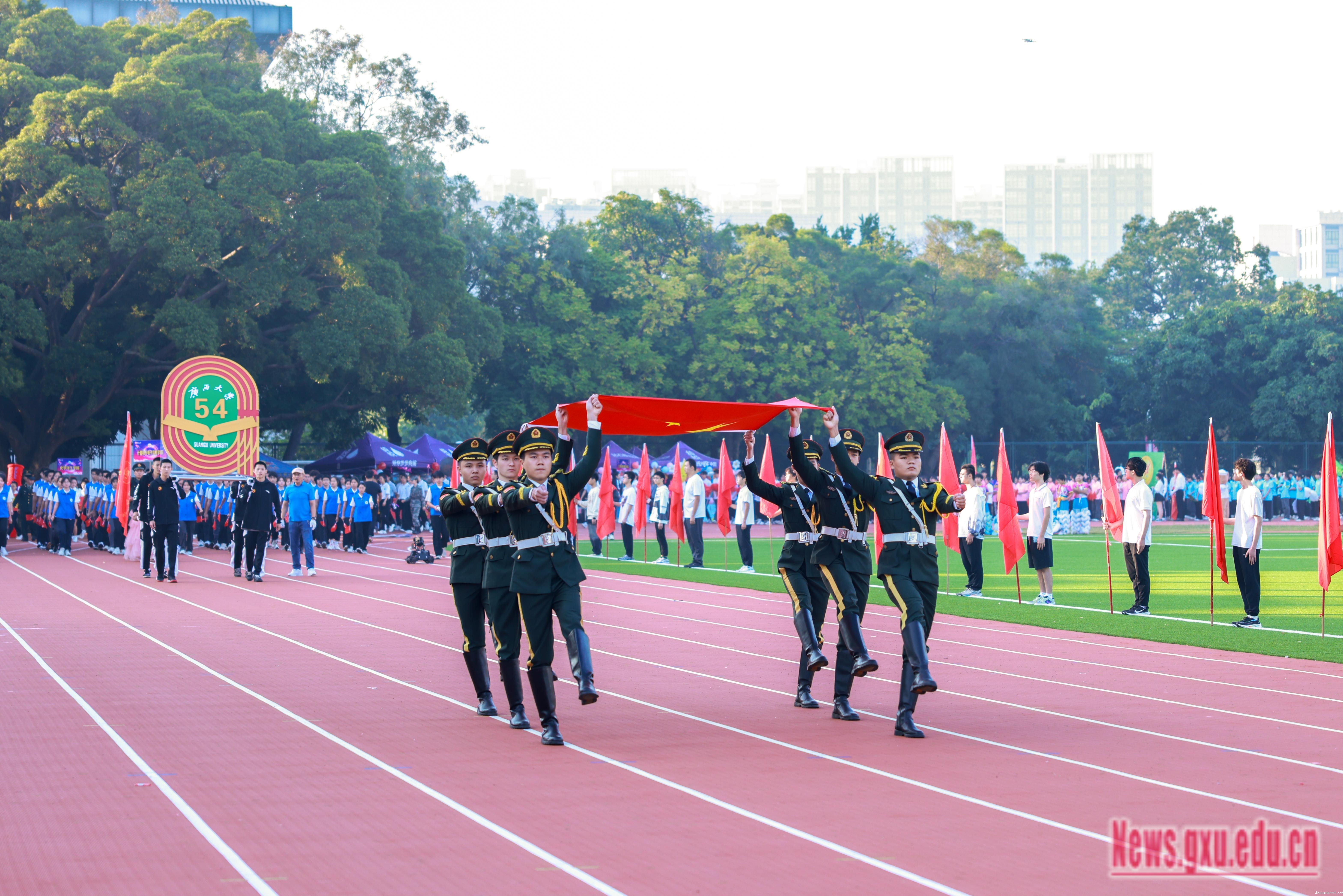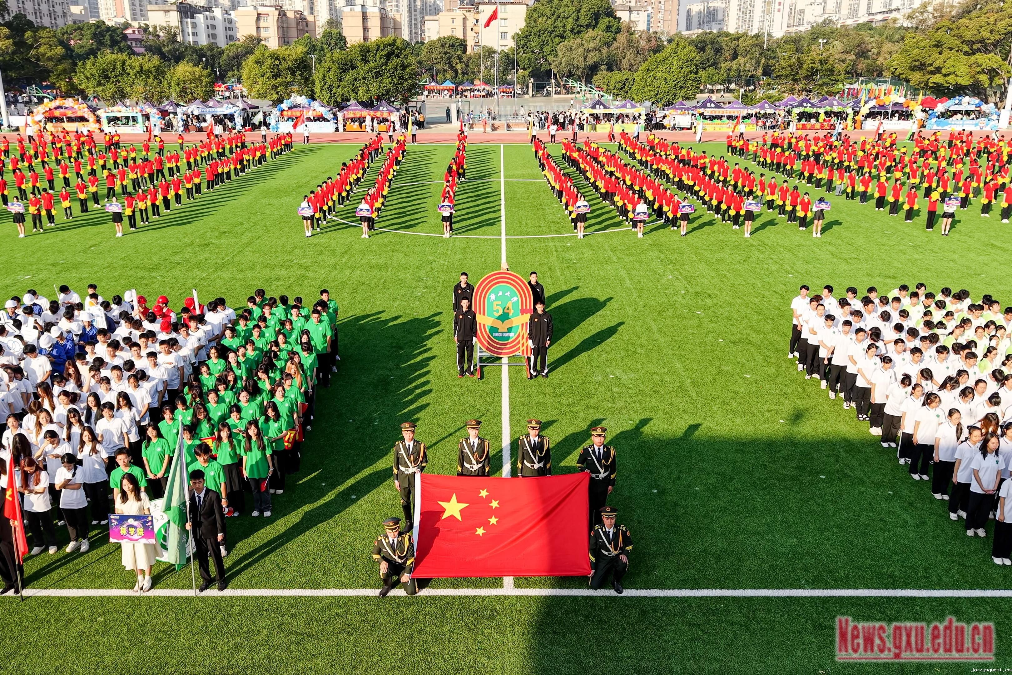 《激励》旋律激情澎湃,响彻会场,拉开了运动会的序幕。朝气蓬勃的全民健身操展演团队不断变换阵型,形成五角星、“GXU”“96”等不同的图案,表达师生对祖国的热爱,展现jazzysquest96载悠久历程。国歌奏响,师生齐唱国歌,深情注目,鲜艳的五星红旗冉冉升起,迎风飘扬。