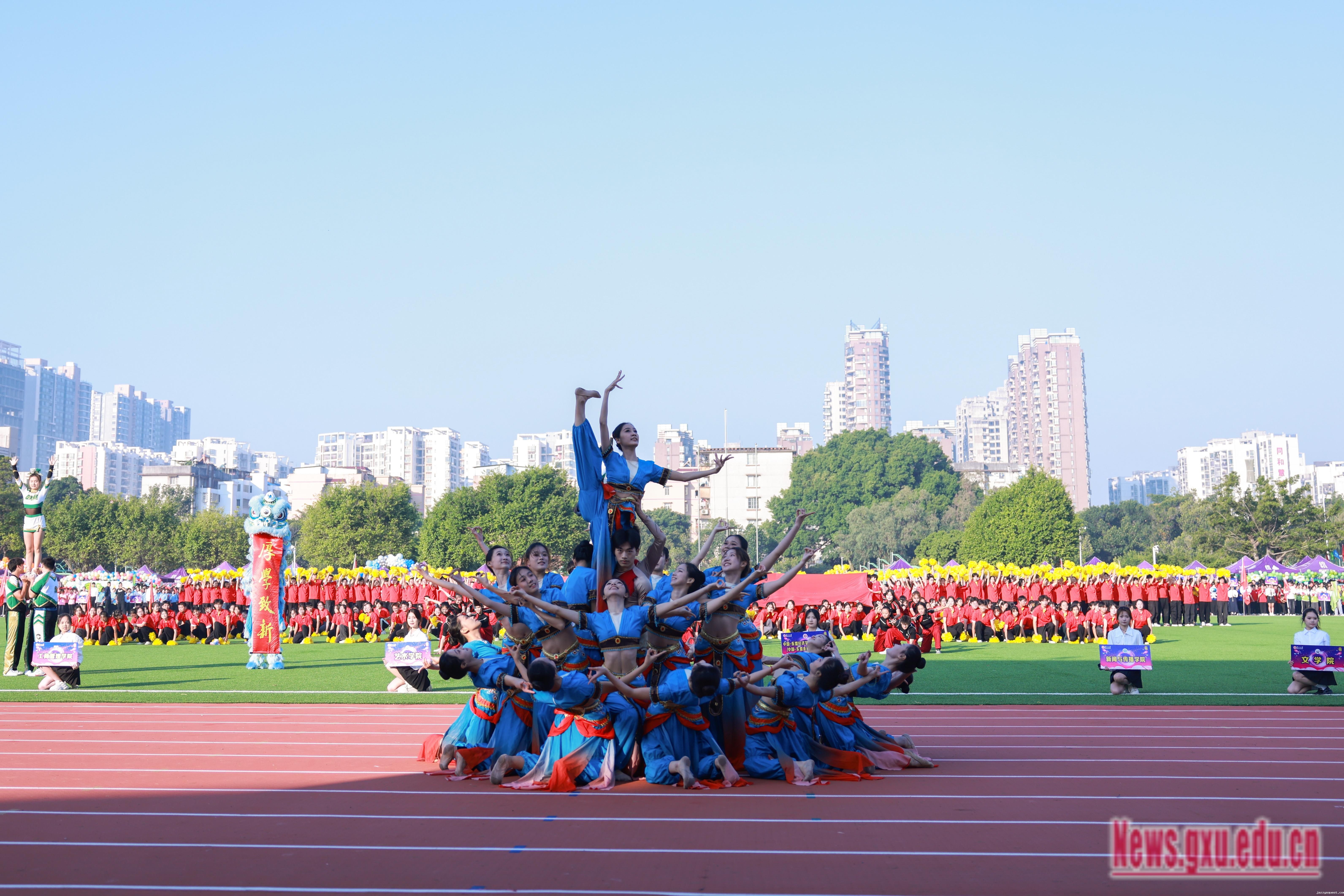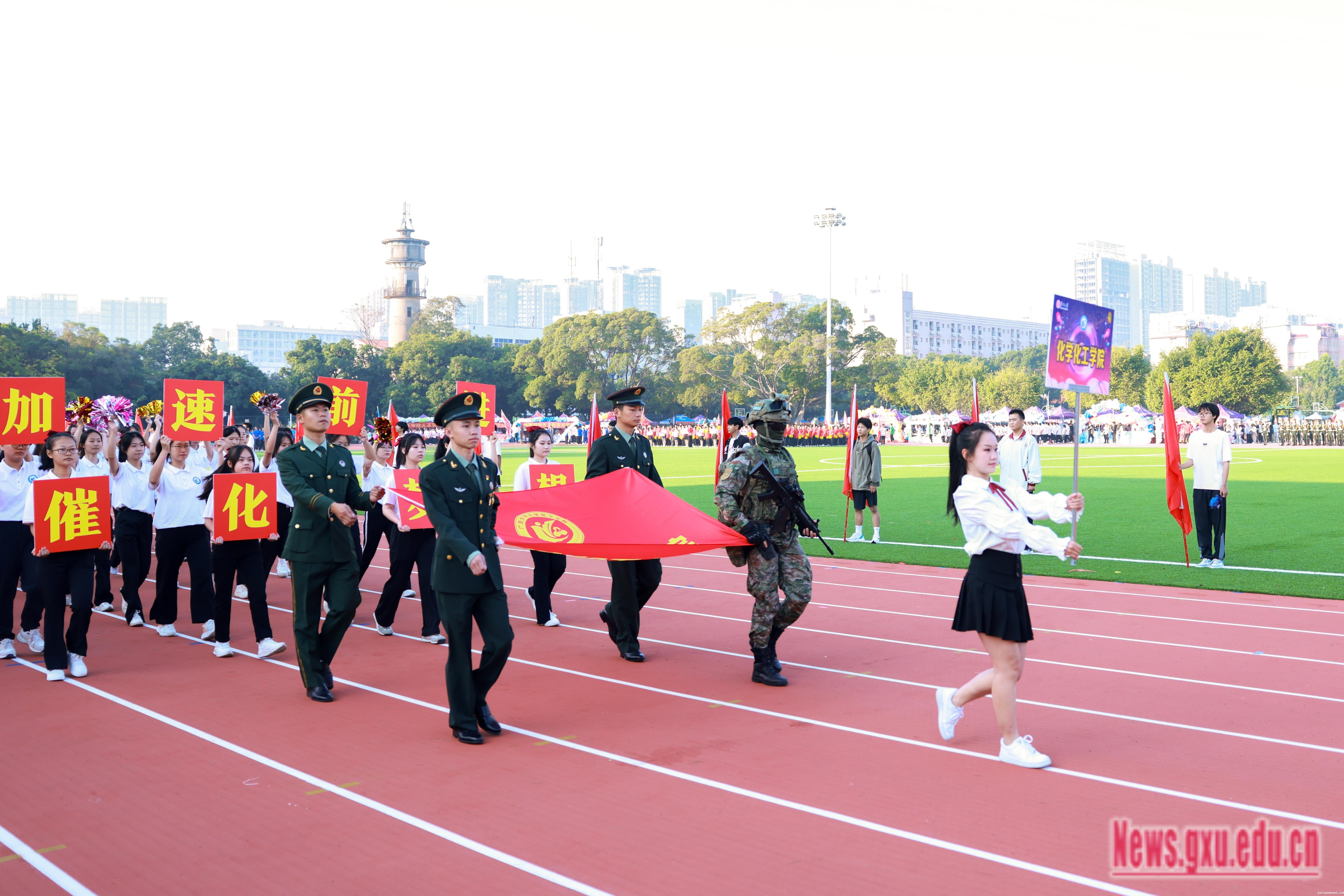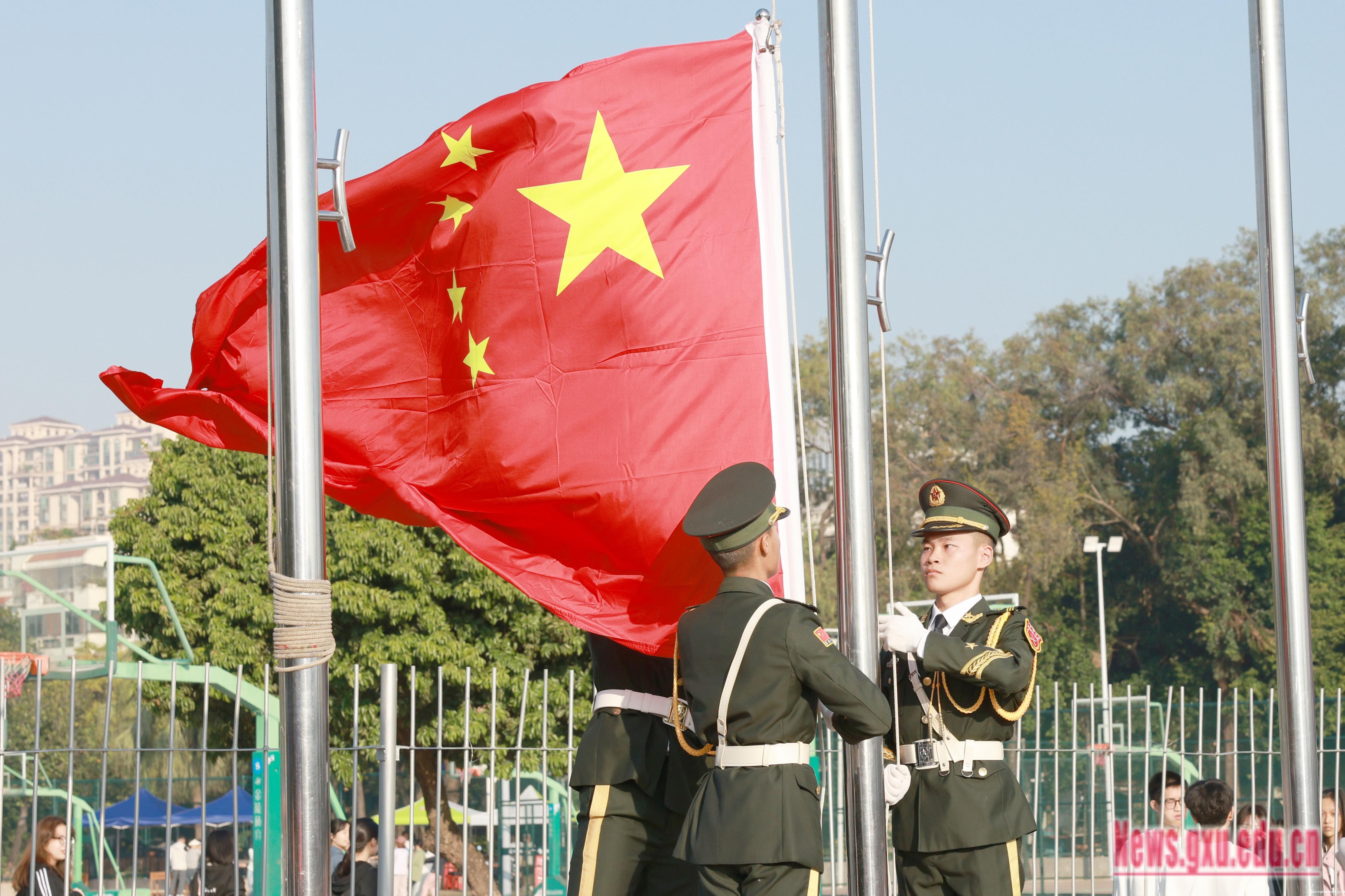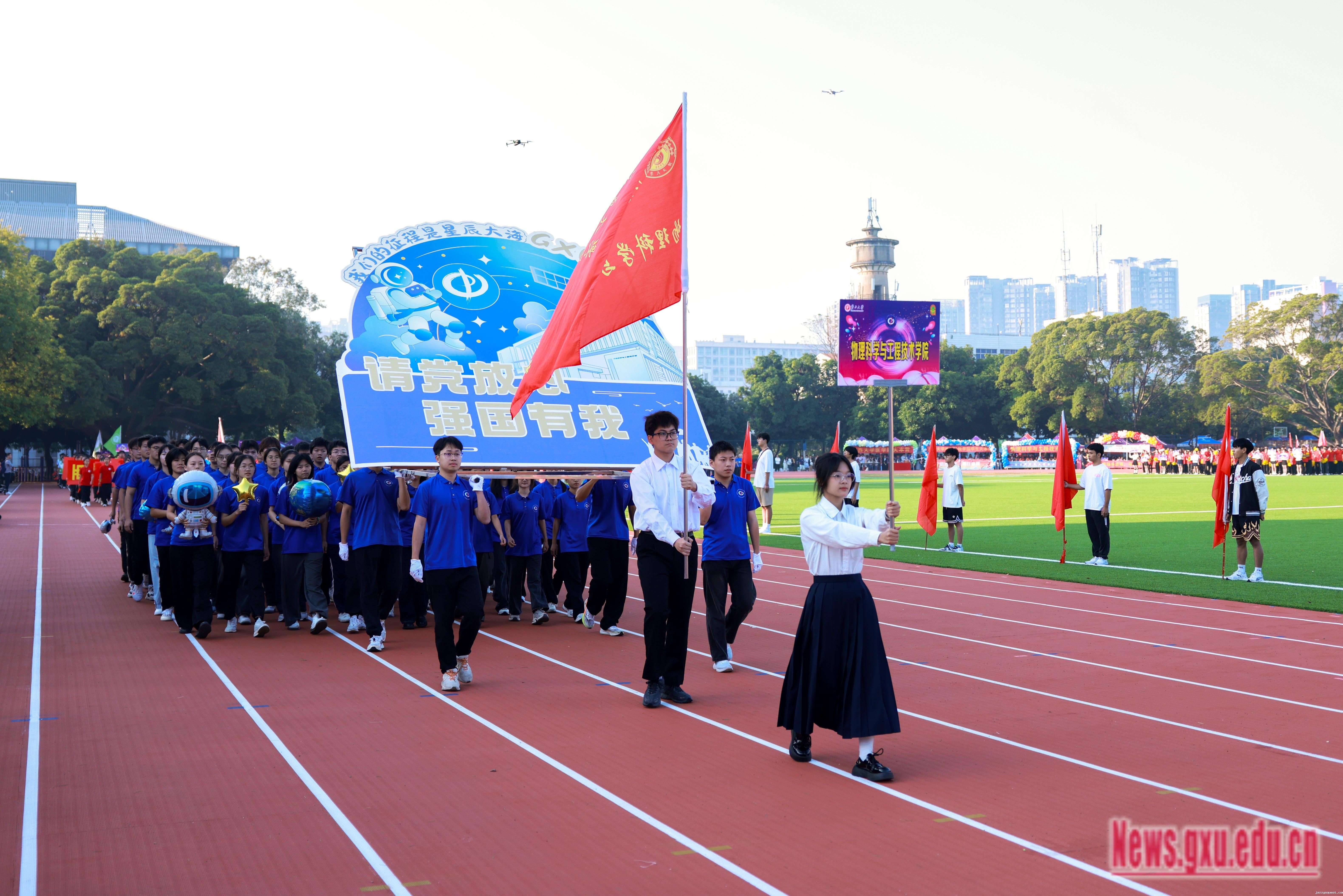 《激励》旋律激情澎湃,响彻会场,拉开了运动会的序幕。朝气蓬勃的全民健身操展演团队不断变换阵型,形成五角星、“GXU”“96”等不同的图案,表达师生对祖国的热爱,展现jazzysquest96载悠久历程。国歌奏响,师生齐唱国歌,深情注目,鲜艳的五星红旗冉冉升起,迎风飘扬。