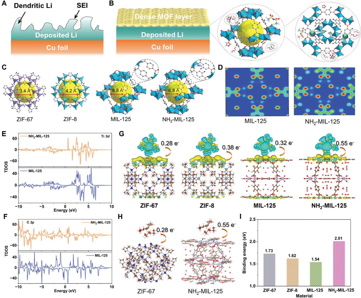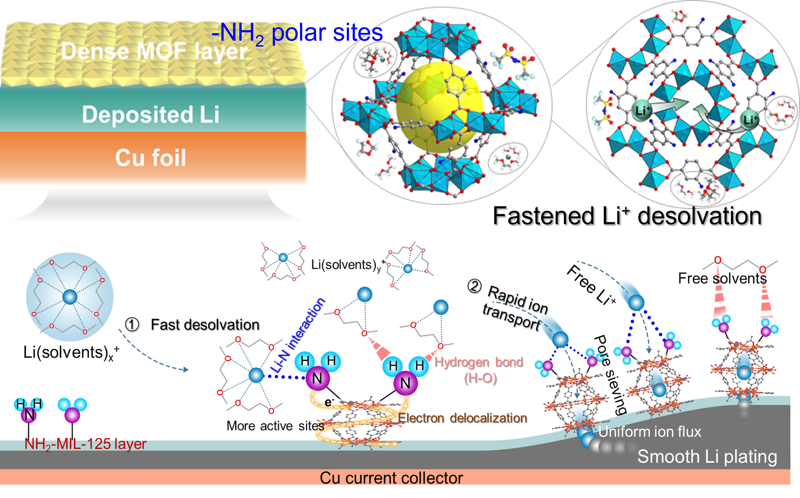 不同于常用的电解液工程策略,我校刘美男教授与德国赫姆霍兹研究所王健博士等合作共同提出了新型的界面协同主动脱溶剂概念。通过设计并引入电子离域型极性基团修饰的多孔金属-有机框架(MOF),该极性电子给体型化学基团显著调节锂离子去溶剂化/扩散行为,展示了高效的锂离子脱溶剂过程,进而极大提升了锂离子界面输运动力学,有效缓解了低温下金属锂枝晶的生长等问题,助力金属锂电池的低温应用。即使在高负载或低温环境下如在-20℃的温度下,所制备的Li-NCM811全电池依旧可以保持130次循环且容量保持率高达97%,为低温锂金属电池的实际应用提供可能。