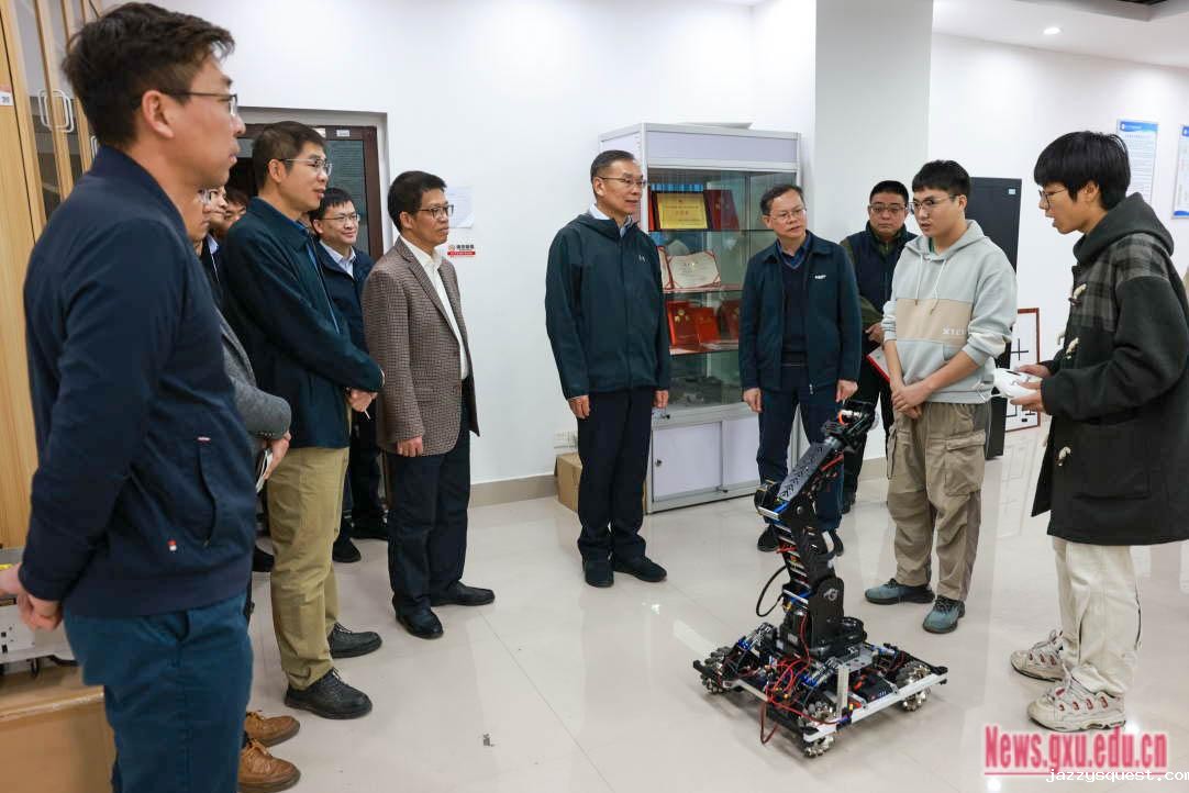 在计算机与电子信息学院,韩林海听取了相关安全工作汇报和人工智能实训室VR/AR领域成果介绍,走访了无人机与机器人实验室,详细询问师生对实验环境条件的需求和竞赛备赛、实验进展等情况,鼓励正在备战robomaster机甲大师比赛的同学们敢于打破学院壁垒,加强多学科交叉融合,组建跨学院团队,携手攻克科技难关。