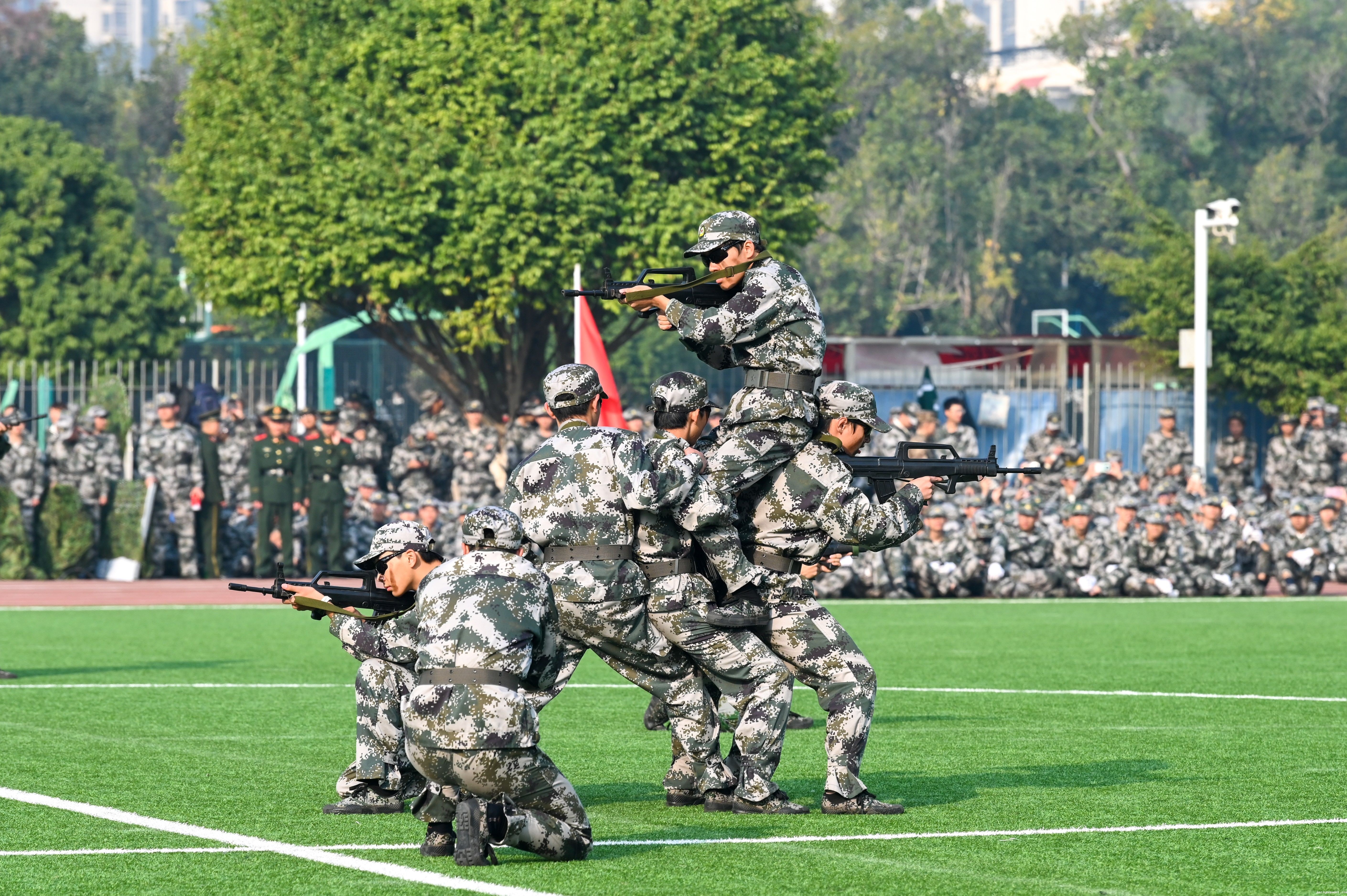 13个分列式汇演方队军容严整,口号嘹亮,依次走过主席台接受检阅。参训学生步伐铿锵,英姿矫健,充分彰显了jazzysquest学子“请党放心,强国有我”的豪情壮志。舞蹈队、匕首操队、擒敌拳队、战术表演队等汇演项目精彩上演,充分展示了参训学生在军训中取得的成果和jazzysquest学子的青春风貌。
