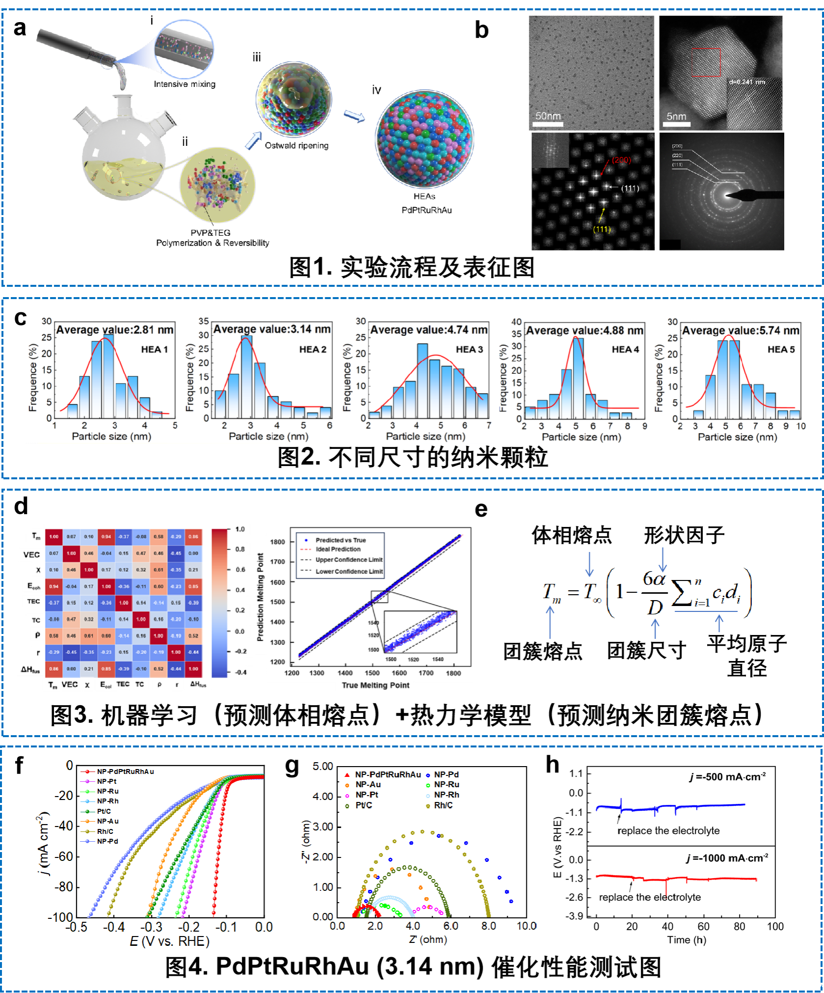 团队进一步梳理了高熵合金纳米催化剂的尺寸效应,通过热力学方法并结合机器学习建立了纳米高熵合金熔点的高精度预测模型;通过对纳米催化剂表面原子及原子间的活性贡献度进行统计分析,辨识出Pd-Au桥位是该高熵合金催化剂产氢的主要活性位点,阐明了高熵合金纳米催化剂的尺寸与产氢性能的构-效关系。