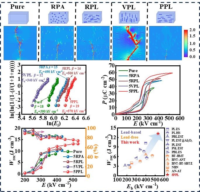 针对上述问题,受自然界天然珍珠层结构启发,该团队创新性地提出一种构建类似有序珍珠层状结构提高击穿强度和储能密度的策略,即在反铁电陶瓷基体中引入具有高击穿强度的Al2O3片状模板,并通过流延技术使Al2O3片有序平行排列,从而构建了“序构化”的反铁电复合陶瓷。研究发现,平行排列的Al2O3片状模板有效阻碍了电荷迁移以及电树击穿路径的发展,将复合陶瓷的击穿强度提高了1.5倍。这种独特的显微结构使陶瓷的储能密度高达13.2 J/cm3,远优于常规结构的陶瓷的储能密度。该研究为面向储能电容器应用的高性能电介质陶瓷的设计提供了一种创新方法。