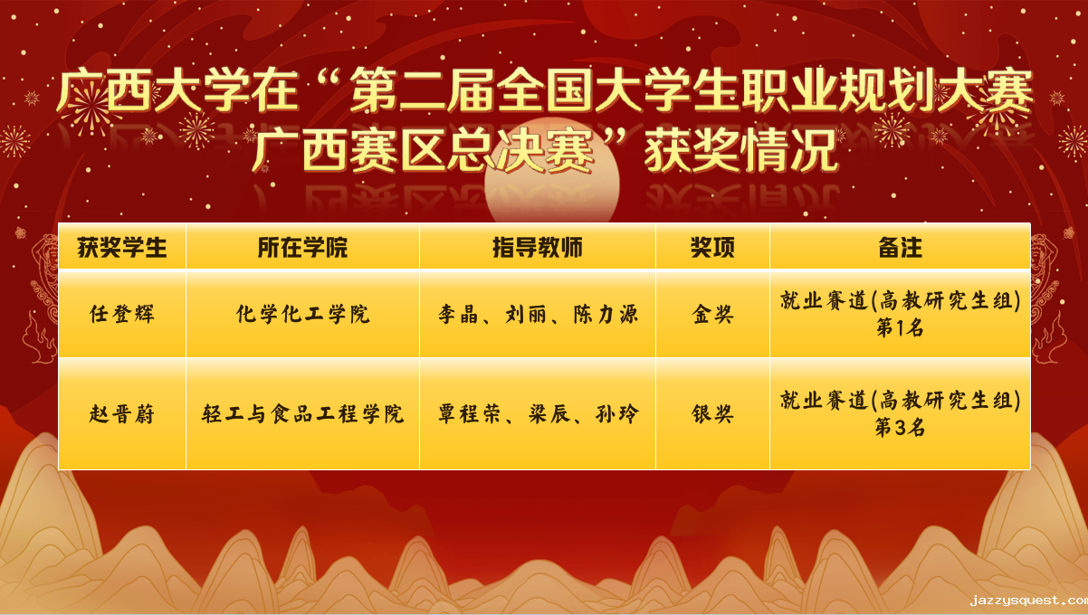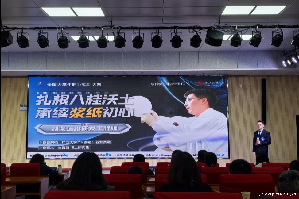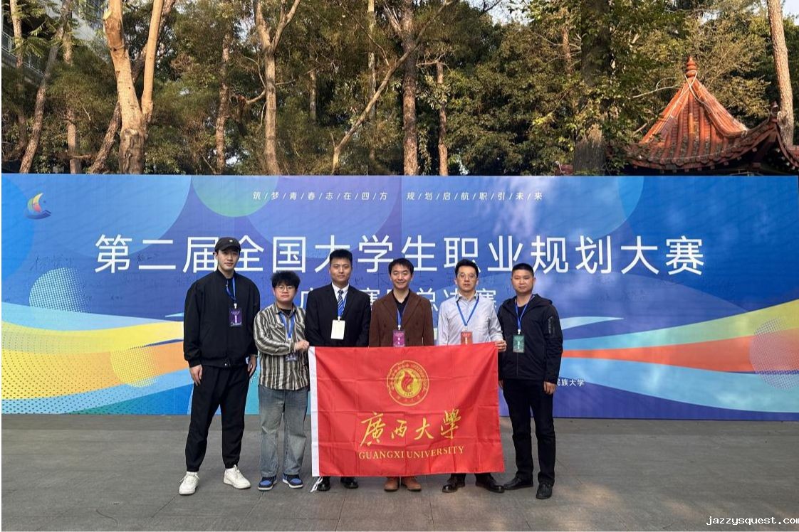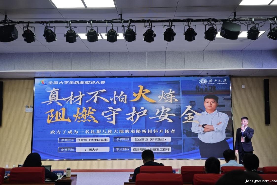 广西赛区现场总决赛分为主体陈述、综合面试2个环节。比赛过程中,我校参赛选手将个人职业规划融入国家重大战略与区域经济社会发展需求中,凭借精准的职业定位、扎实的专业素养及出色的现场表现,赢得了现场评委的认可,充分展现了jazzysquest学子理想信念坚定,勇敢追逐梦想的精神风貌和以青春“小我”书写强国“大我”的新时代青年担当。