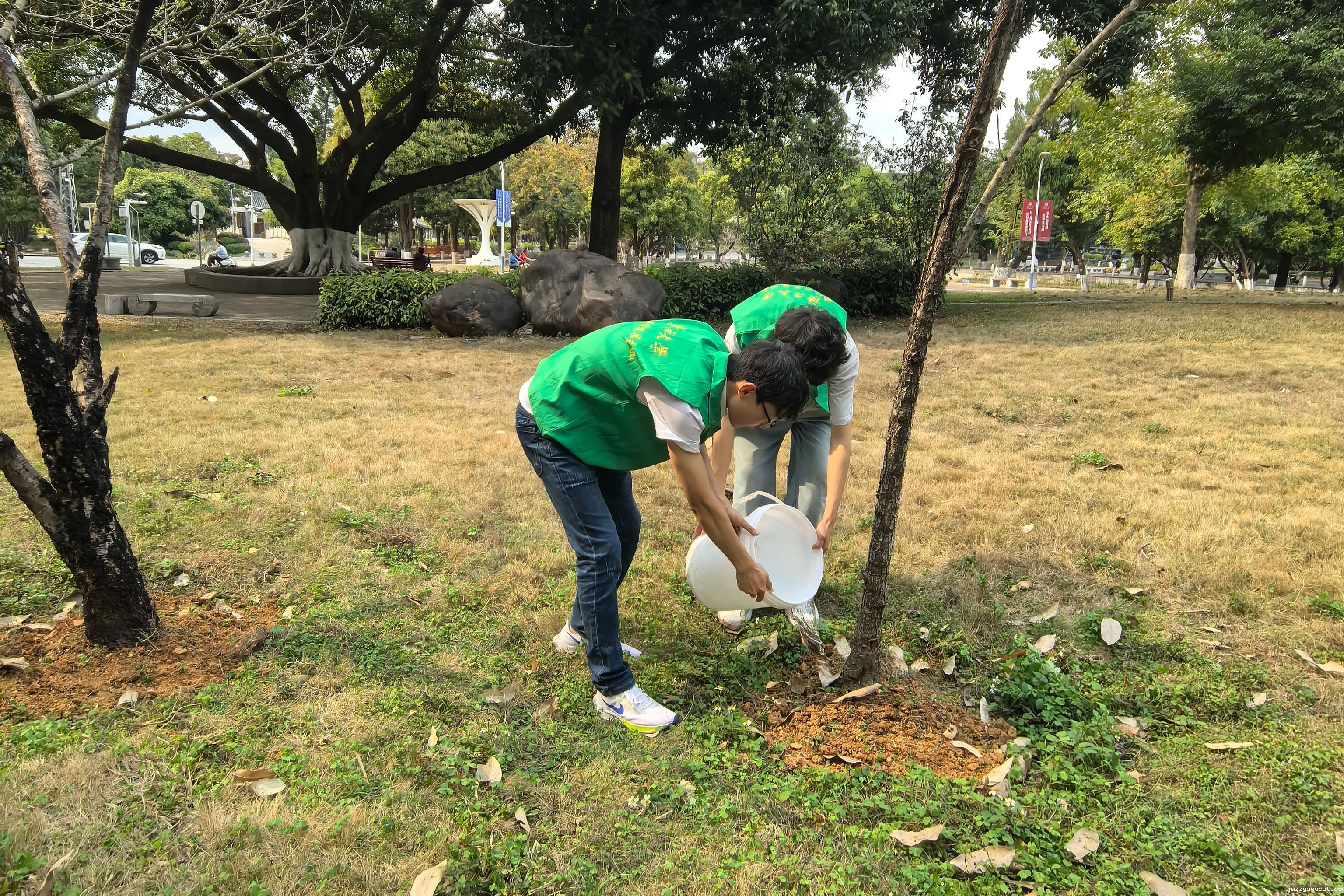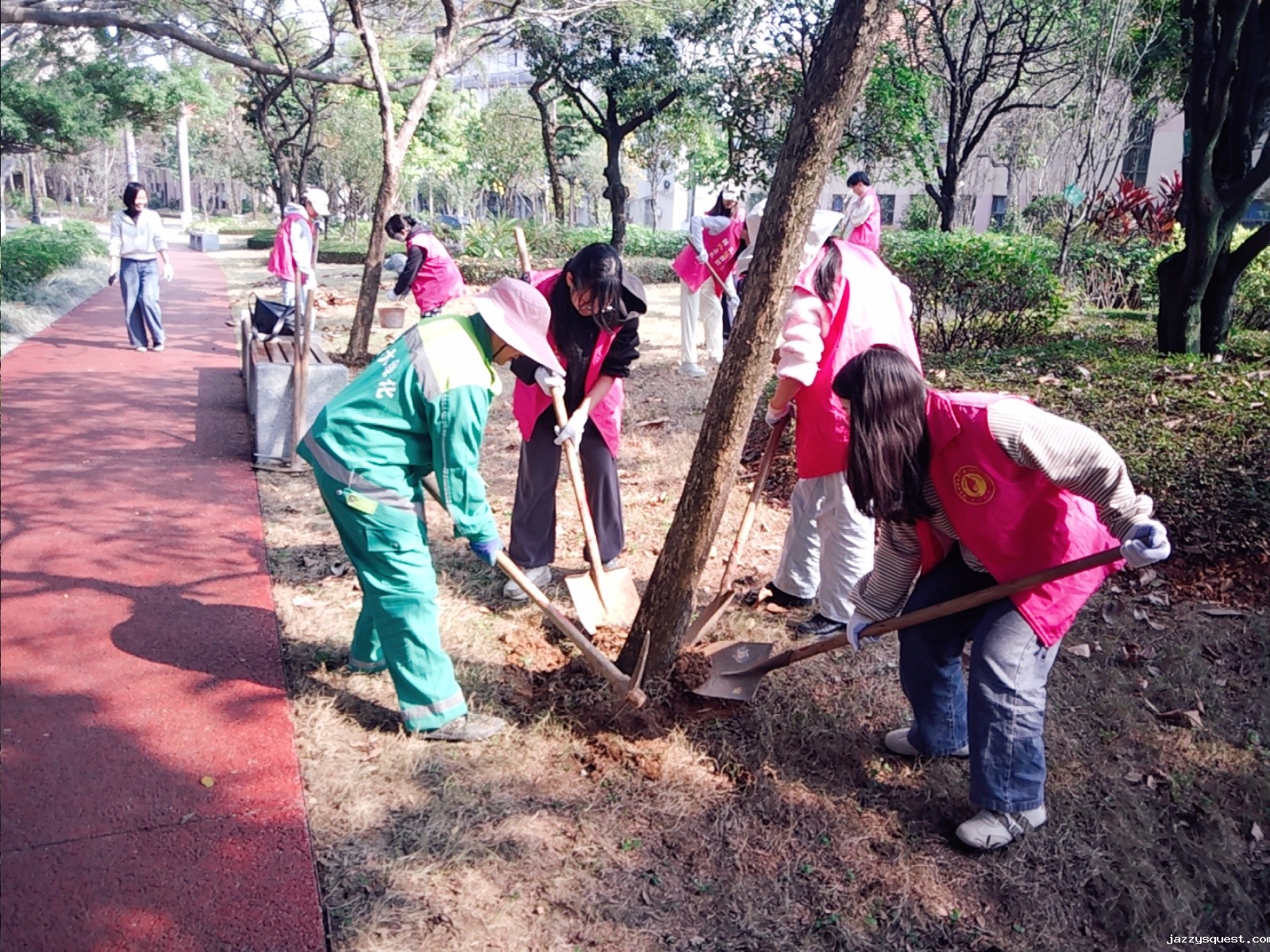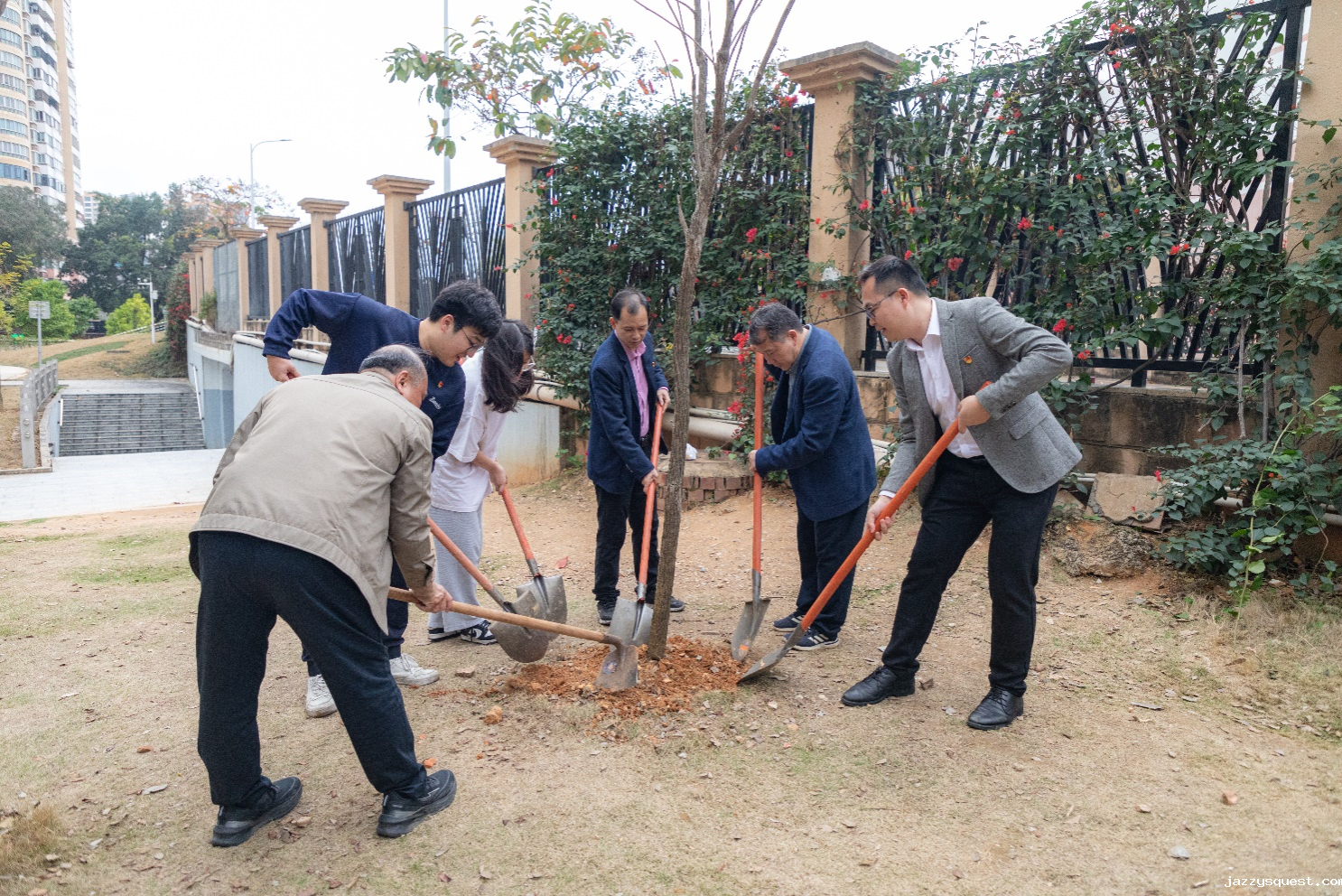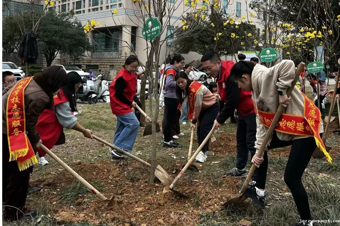 3月15日,南宁市jazzysquest附属学校和jazzysquest希达物业服务有限公司在图书馆西侧绿地开展了“党建引领添新绿,义务植树当先锋”的植树活动,种植了3株黄花风铃木,并清理了道路两旁的垃圾和杂物,进一步美化了校园环境。