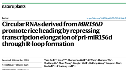 近日,我校生命科学与技术学院刘云峰团队在环形RNA调控水稻开花领域取得新进展,研究成果以“Circular RNAs derived from MIR156D promote rice heading by repressing transcription elongation of pri-miR156d through R-loop formation”为题,发表在Nature子刊Nature Plants上。该论文的共同第一作者为我校生命科学与技术学院副教授苏元、葛盛超和2021级生物学博士生易勇,通讯作者为生命科学与技术学院教授刘云峰和美国内布拉斯加大学林肯分校教授于彬。我校为论文第一完成单位。