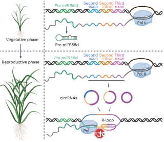 开花时间(抽穗期)作为水稻的重要农艺性状之一,不仅决定了水稻品种的种植地区和季节适应性,还与水稻的产量、品质和抗逆性密切相关。水稻开花期的调控网络非常复杂,通过对内源和外源信号的响应,主要由3条途径控制开花抽穗,分别是光周期途径、温度途径和年龄途径。其中年龄开花途径的分子钟miR156随着植物年龄的增长而降低,最终调控水稻从营养生长到生殖生长的转变。然而,调节miR156年龄依赖性表达模式的分子机制仍不清楚。该团队首次报道了来源于水稻pri-miR156d的环状RNA(ciMIR156Ds)通过与其模板DNA形成R-loop的方式负调控miR156水平的全新分子机理。该研究发现ciMIR156D水平随植物年龄增长而增加,并能降低pri-miR156d和miR156的水平,启动水稻开花抽穗进程。ciMIR156Ds与MIR156D在母基因形成R-loop,该结构减少了RNA聚合酶II的转录延伸,从而阻碍了pri-miR156d的合成。这些发现揭示了一种通过环形RNA精细调控年龄开花途径分子钟miR156的新颖机制,为培育抽穗期多样化的水稻品种提供了新的理论依据。