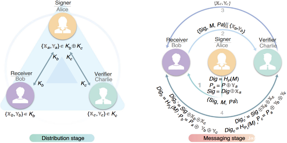 针对这一目标,我校量子信息与量子通信团队和国家信息光电子创新中心肖希团队基于前期发展的具有偏振追踪能力的偏振编码量子密钥分发解码器芯片、资源节约型的芯片化量子密钥分发系统以及芯片集成的源无关量子随机数发生器等领域的技术积累,联合中国人民大学副教授尹华磊团队,提出了一种创新的星型拓扑QDS网络架构(图1所示),并发展了单诱骗态一次全域哈希QDS协议(图2所示),在提高系统性能的同时极大降低了系统硬件和数据后处理的复杂度,并基于硅基编码器和解码器芯片完成三节点量子数字签名网络示范。