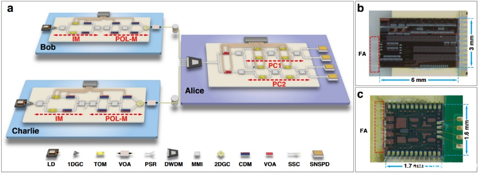 图3.实验设置。(a) 基于芯片的三节点量子网络。(b) 硅基编码器芯片的显微图。 (c) 硅基解码器芯片的显微图。
