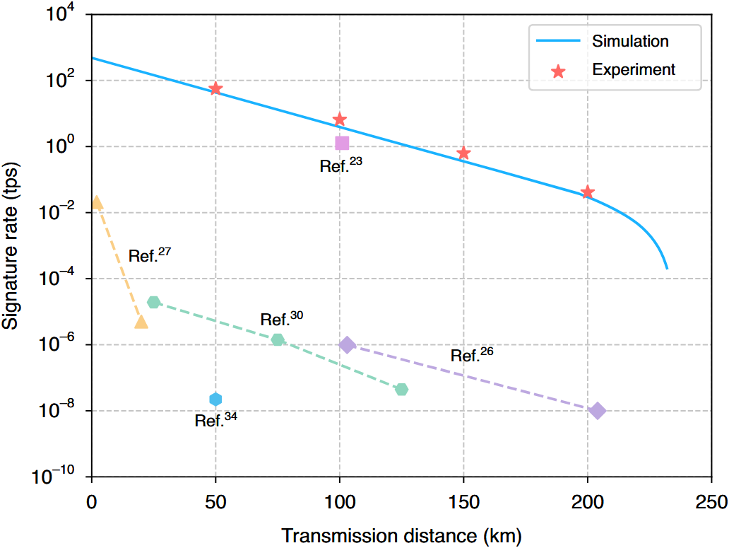 研究团队基于所提网络配置,采用发展的新型QDS协议开展实验,汇总了不同距离下开展QDS实验获得的结果,展示了该研究带来的突破。所提的芯片化QDS方案在200 km的光纤距离下,签名1Mbit文件实现了0.04次每秒的签名速率。这一研究不仅推动了QDS技术的实用化进程,还在量子电子商务、量子区块链等其他量子通信领域具有广泛的应用价值。