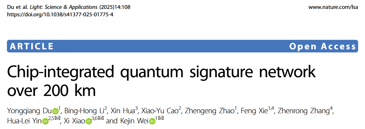 近日,我校量子信息与量子通信团队在芯片嵌入的高效率量子数字签名网络研究方面取得新进展,研究成果以“Chip-integrated quantum signature network over 200 km”为题发表在国际光学期刊Light: Science & Applications。论文的第一作者为我校物理科学与工程技术学院2022级博士研究生杜永强,南京大学物理学院博士研究生李炳宏、曹啸宇,国家信息光电子创新中心博士华昕,通讯作者为我校物理科学与工程技术学院教授韦克金、中国人民大学副教授尹华磊、国家信息光电子创新中心总经理肖希。我校为论文的第一单位及通讯单位。