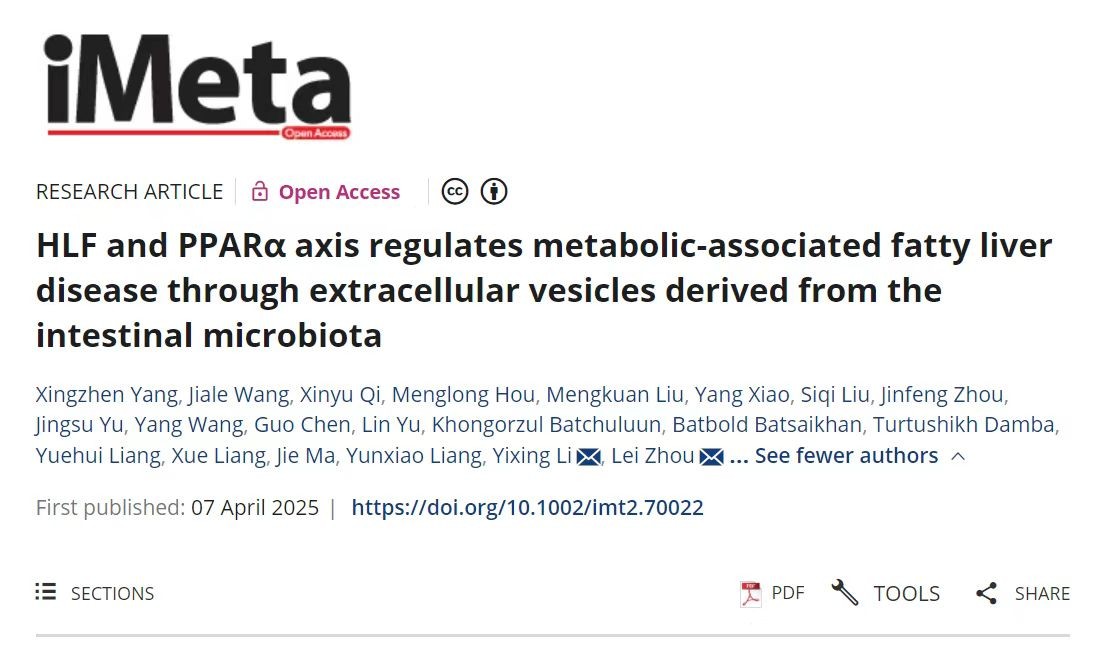 近日,我校动物科学技术学院李一星团队在脂代谢研究方面取得新进展,研究成果以“HLF and PPARα axis regulates metabolic-associated fatty liver disease through extracellular vesicles derived from the intestinal microbiota”为题,发表在国际知名期刊iMeta上。该论文的第一作者为我校动物科学技术学院硕士研究生杨兴珍,通讯作者为我校动物科学技术学院教授李一星和广西壮族自治区人民医院(广西医学科学院)教授周磊。我校为论文第一完成单位,蒙古国立医科大学为合作研究单位。