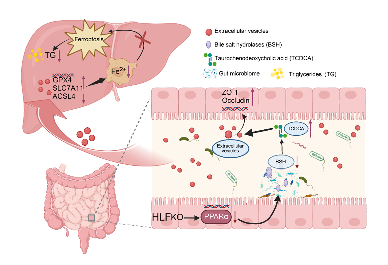 该团队首次报道了肠道中的肝白血病因子(HLF)调控肝脏脂代谢的分子机制。该研究发现抑制HLF/PPARα轴通过影响肠道微生物来源的细胞外囊泡(fEVs)调节肠-肝轴、抑制肝细胞铁死亡,从而减少肝脏脂肪沉积、缓解脂肪肝,其中结合型胆汁酸牛磺鹅去氧胆酸(TCDCA)为fEVs发挥降脂作用的关键分子。这些发现揭示了HLF调控肠-肝轴、影响脂代谢的新机制,为治疗相关疾病提供了一种低成本、安全高效的新途径,也为畜禽营养代谢的精准调控和新型饲料添加剂的开发提供了理论依据。
