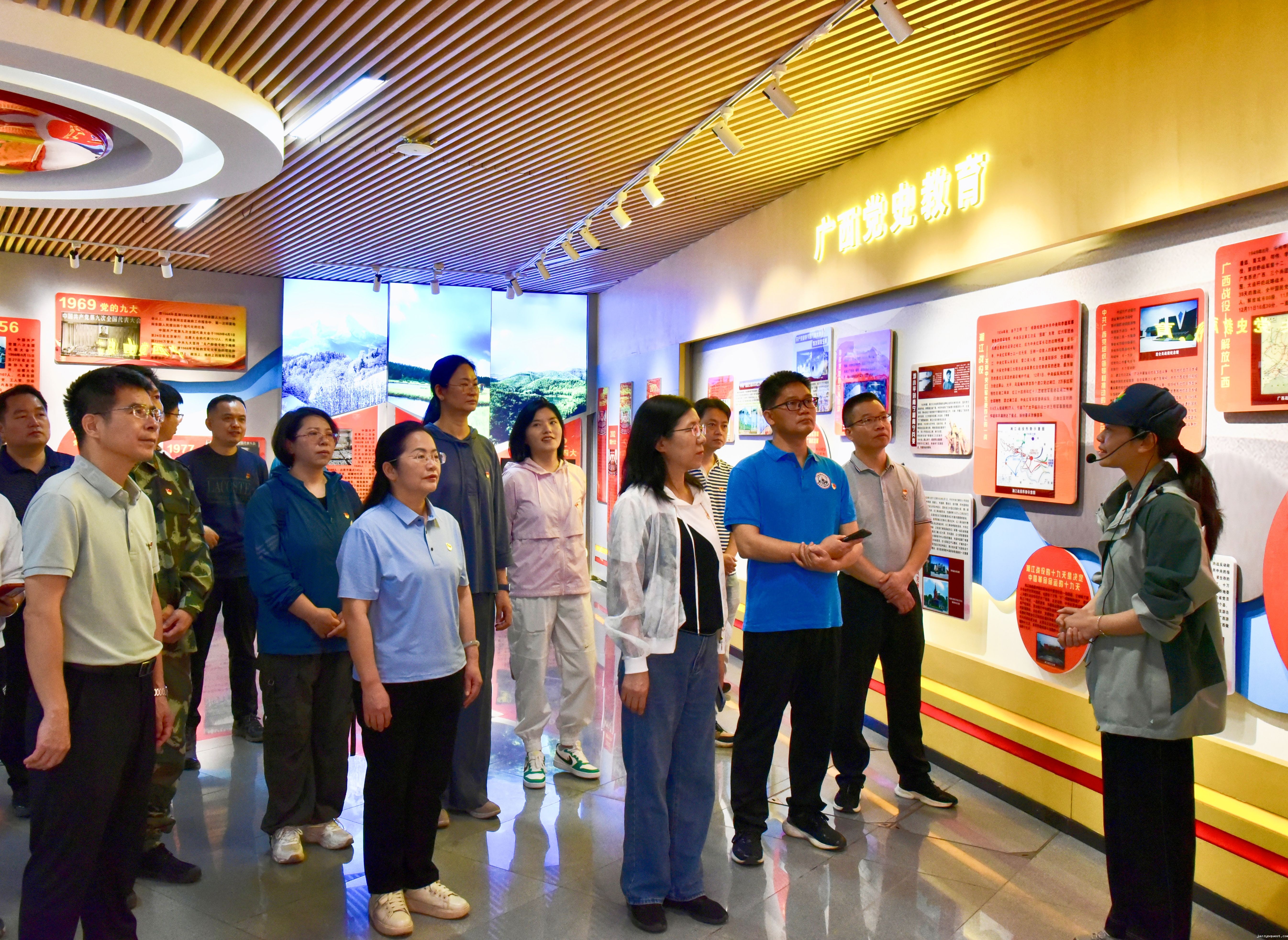 在林场党性教育基地,党员同志们依次参观中共党史教育长廊、广西党史专题展及廉政教育警示区等板块,通过学习党的历次代表大会光辉历史、广西党史及优秀共产党员先进事迹,厚植廉洁文化根基。