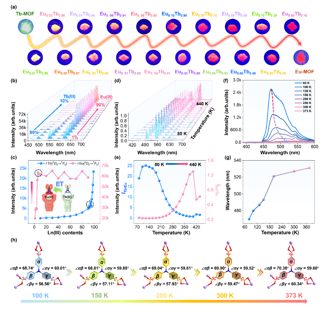 该团队创新性地利用动态的分子转子,首次构建了具有自适应天线效应的智能稀土金属有机框架发射体,并精准调控了能量转移途径,实现了高效的智能发光切换行为、上转化发光和多重智能防伪等应用。具体而言,错位且反向平行的分子转子配体与单核的次级构建单元交错连接,形成了在强酸和强碱水溶液中均具有高稳定性的层状的Ln-MOFs,能够通过温度调节有效控制分子转子的运动或者扭曲程度,激活动态变化的天线效应匹配不同的稀土离子,进而实现可循环的发光切换行为及复杂的多重加密防伪技术。此外,由于分子转子配体与Eu(III)离子高度匹配的能级水平,仅含有1%的Eu(III)的Gd0.99Eu0.01-MOF就能够显示出明亮的红色发光,并且在Eu(III)含量为1% ~ 9%的范围内,Eu(III)离子的特征发射强度与含量呈现出了斜率k高达2298.7的优异线性关系,为甄别不同厂家钆盐中极低含量的Eu(III)离子杂质提供了有效手段。