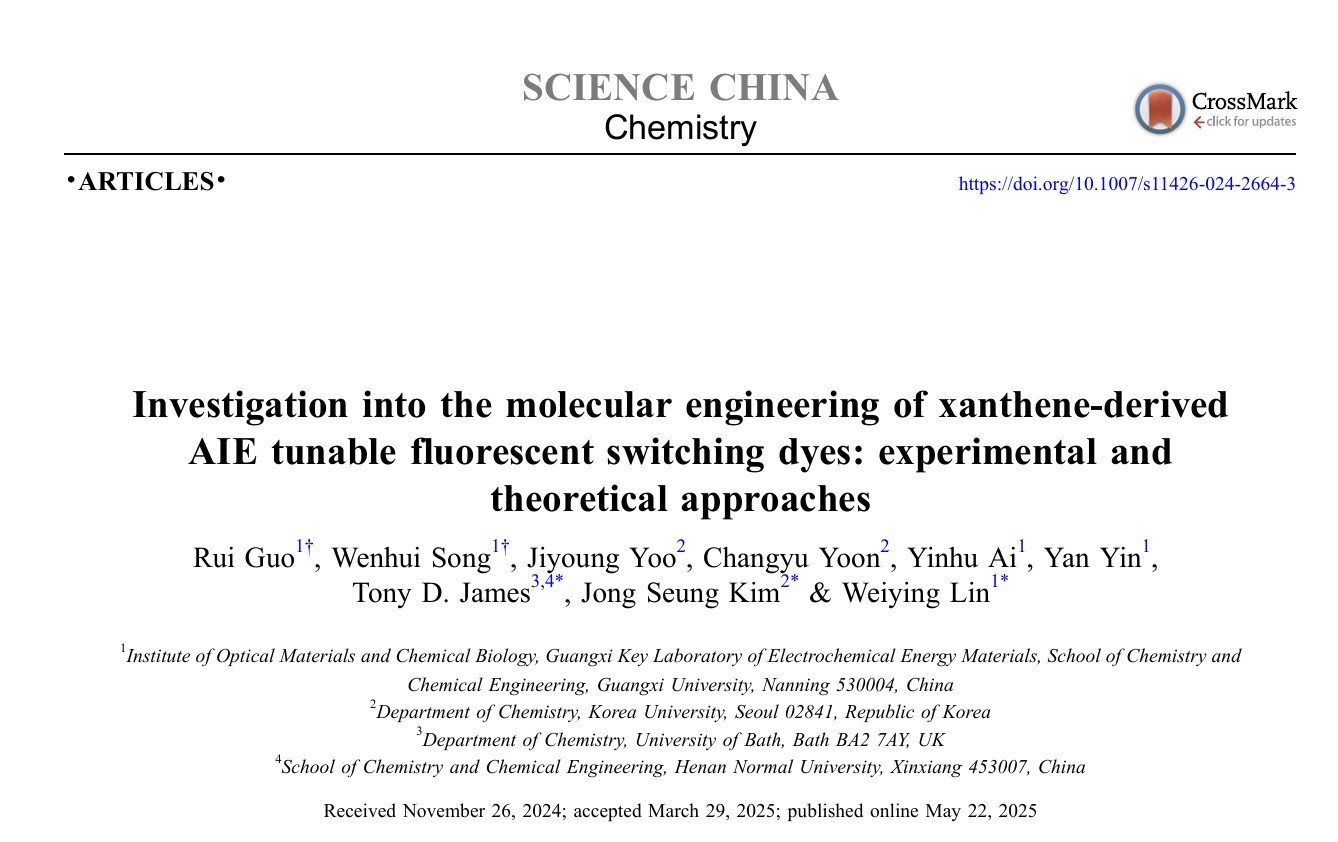 近日,我校化学化工学院探针与化学生物学团队在聚集诱导发光新型染料开发领域取得新进展,相关成果以Investigation into the molecular engineering of xanthene-derived AIE tunable fluorescent switching dyes: experimental and theoretical approaches为题,发表于国际学术期刊Science China Chemistry。该论文的第一作者为我校化学化工学院助理教授郭锐和博士研究生宋文辉,通讯作者为化学化工学院教授林伟英,taptap苹果安装为第一通讯单位。